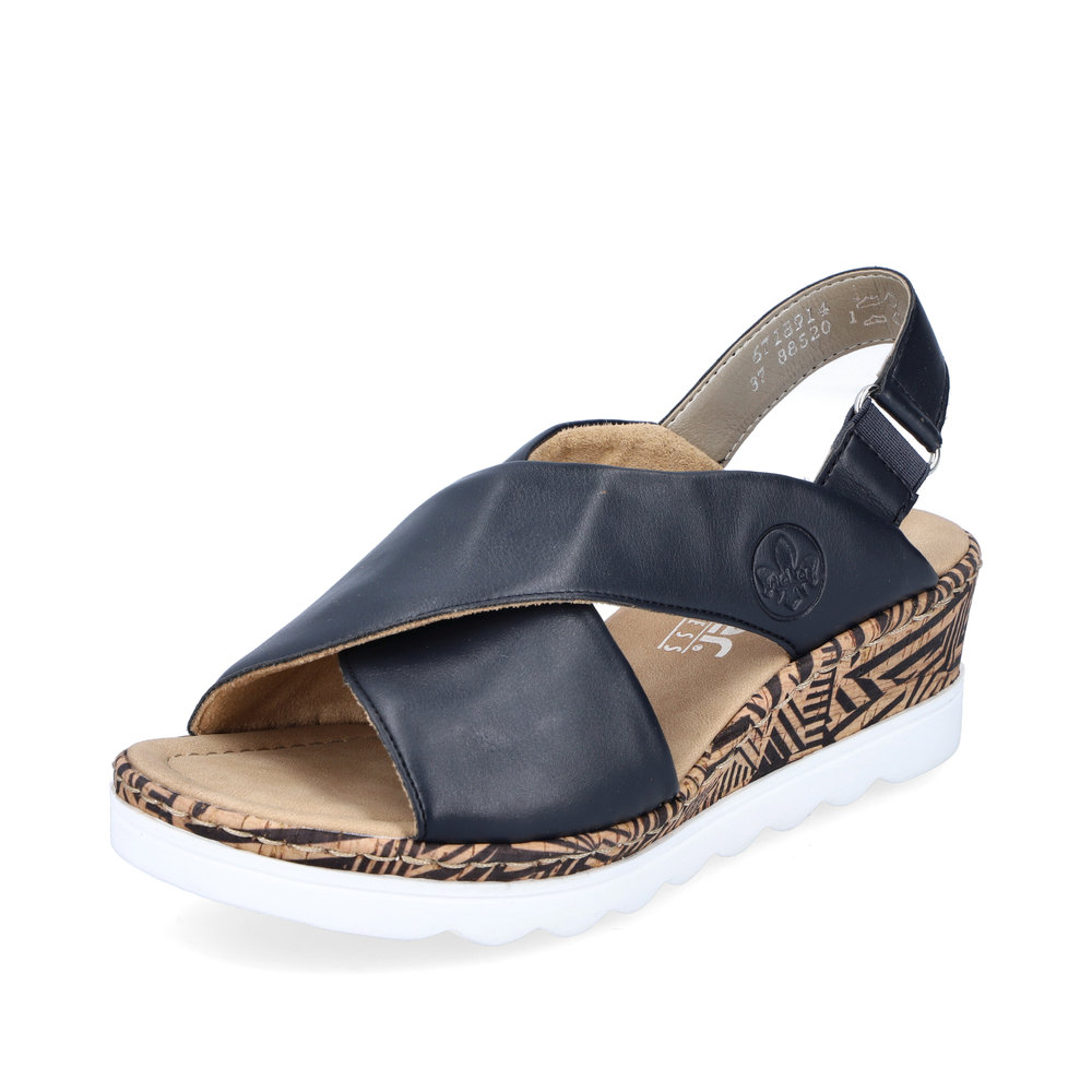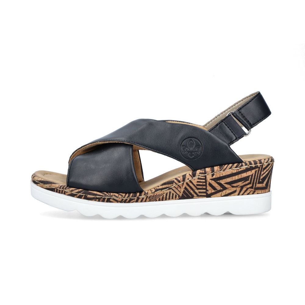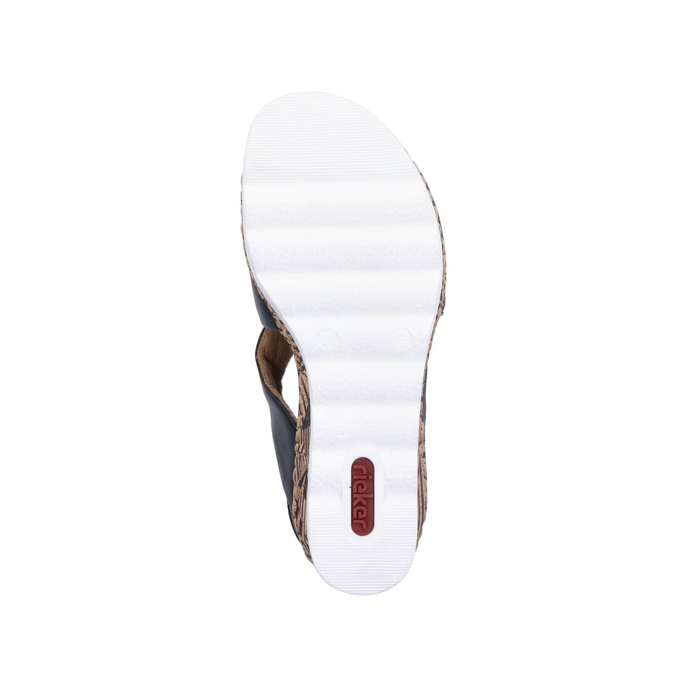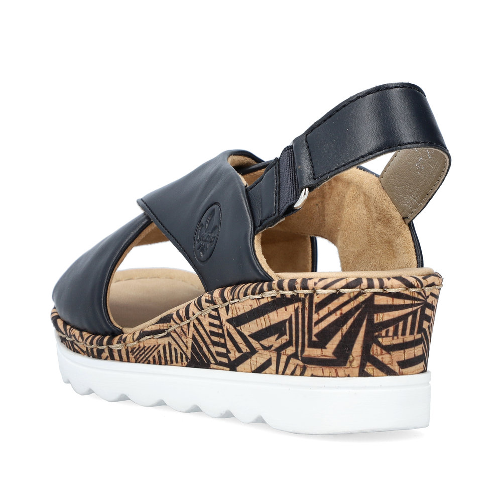 Hledáte pohodlné dámské sandály na klínku značky Rieker, které se hodí na celodenní nošení? Tak jste je právě našla! Velmi oblíbenou tmavě modrou barvu doplňuje zajímavý barevný vzor na klínku. Pohodlí Vám zajistí pružinka na pásku za patou. Díky tomu se obuv lépe přizpůsobí Vaší noze. Pohodlná měkká stélka a flexibilní podešev s funkcí Antistress, která skvěle tlumí nárazy a otřesy Vám zajistí, že budete moct být v botech klidně celý den. Technologie: Antistress - podešev je díky této technologii lehká, flexibilní, absorbuje nárazy při došlapu a snadno se přizpůsobí každé noze.