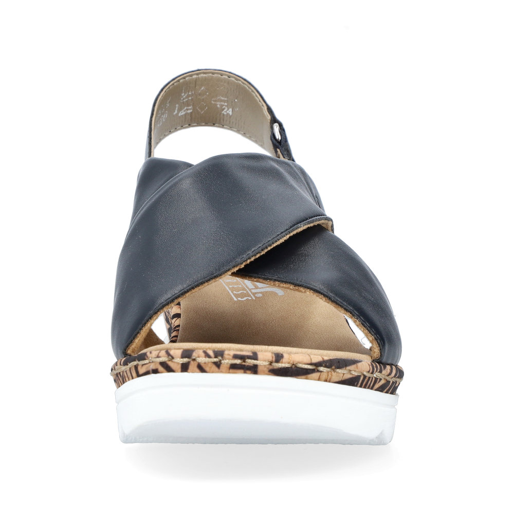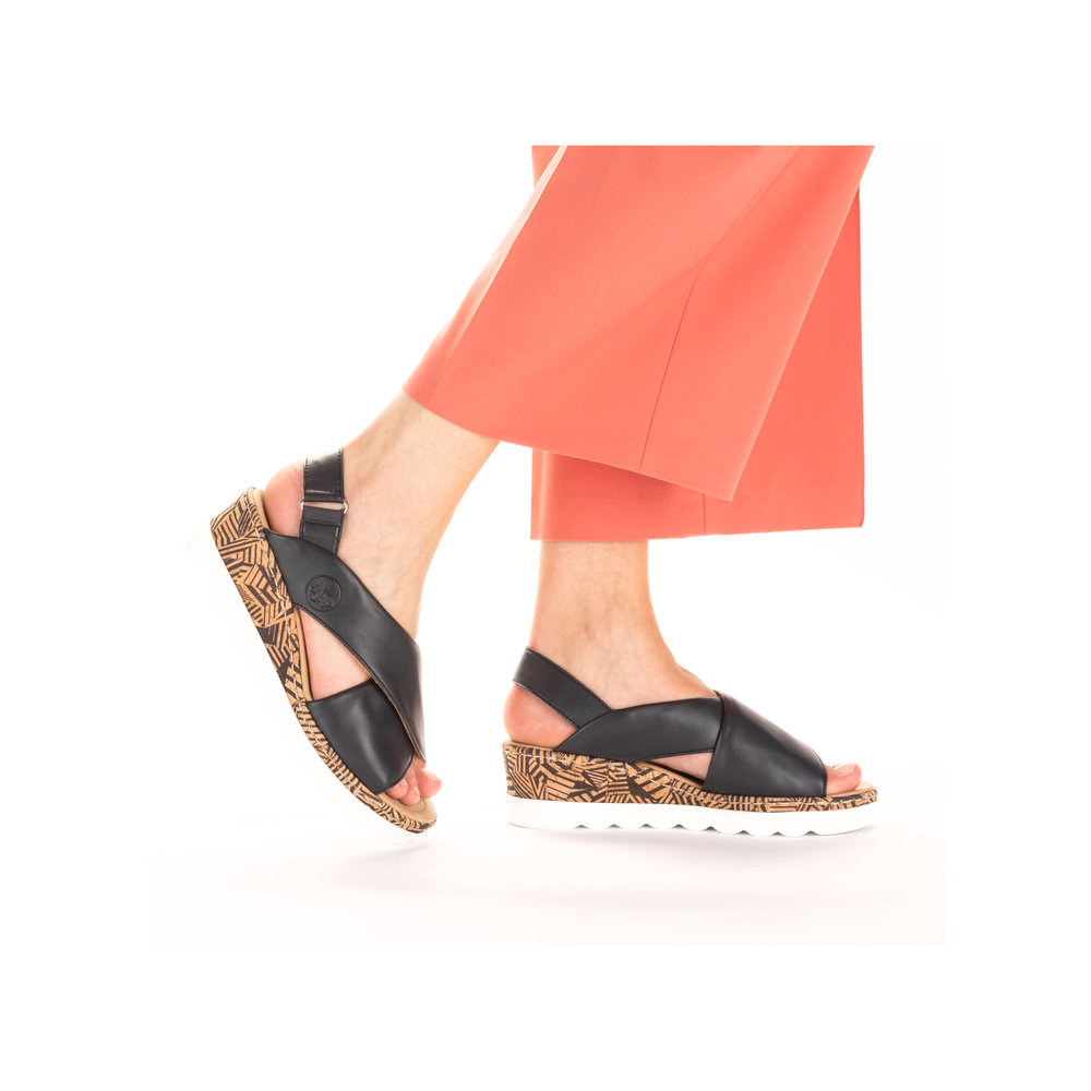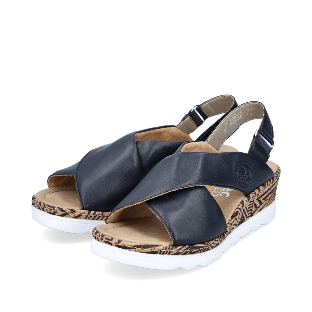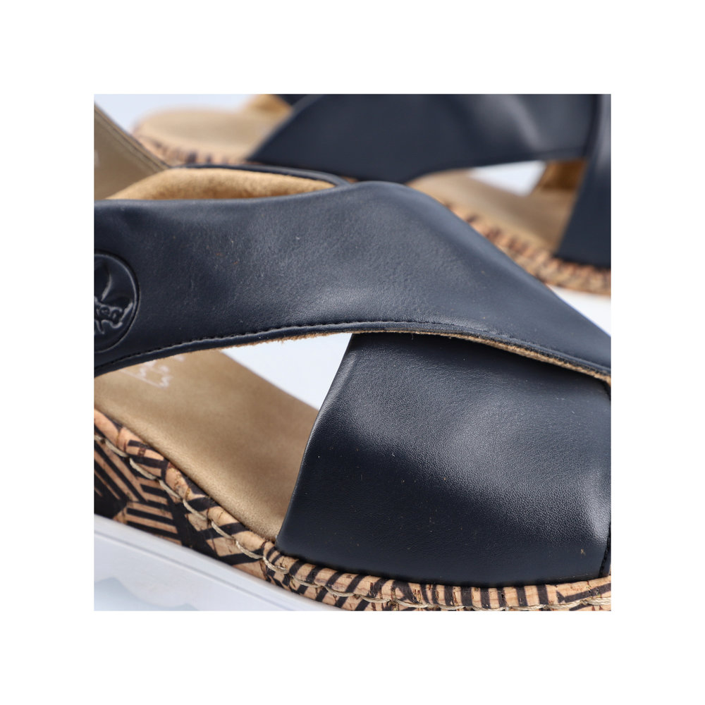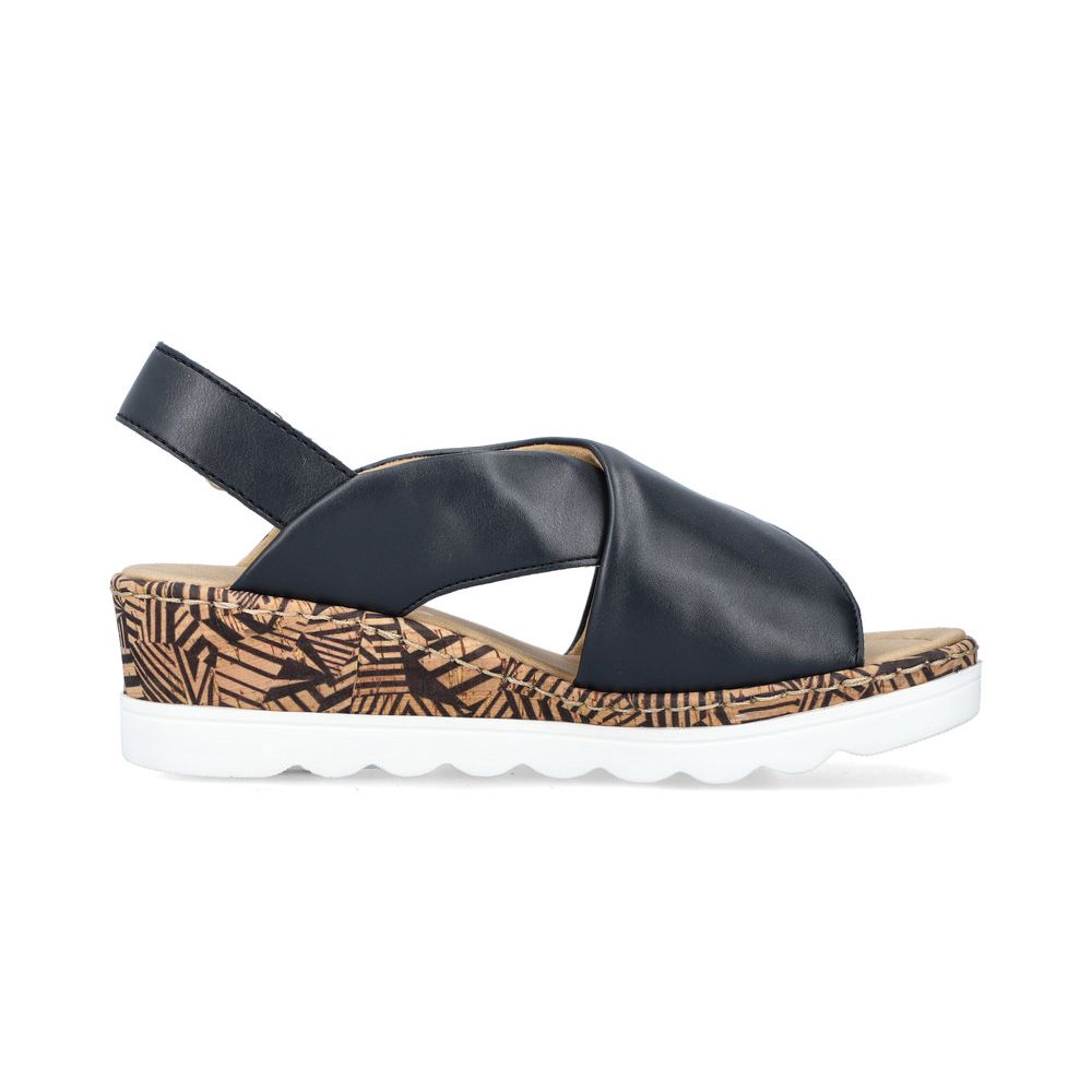Hledáte pohodlné dámské sandály na klínku značky Rieker, které se hodí na celodenní nošení? Tak jste je právě našla! Velmi oblíbenou tmavě modrou barvu doplňuje zajímavý barevný vzor na klínku. Pohodlí Vám zajistí pružinka na pásku za patou. Díky tomu se obuv lépe přizpůsobí Vaší noze. Pohodlná měkká stélka a flexibilní podešev s funkcí Antistress, která skvěle tlumí nárazy a otřesy Vám zajistí, že budete moct být v botech klidně celý den. Technologie: Antistress - podešev je díky této technologii lehká, flexibilní, absorbuje nárazy při došlapu a snadno se přizpůsobí každé noze.