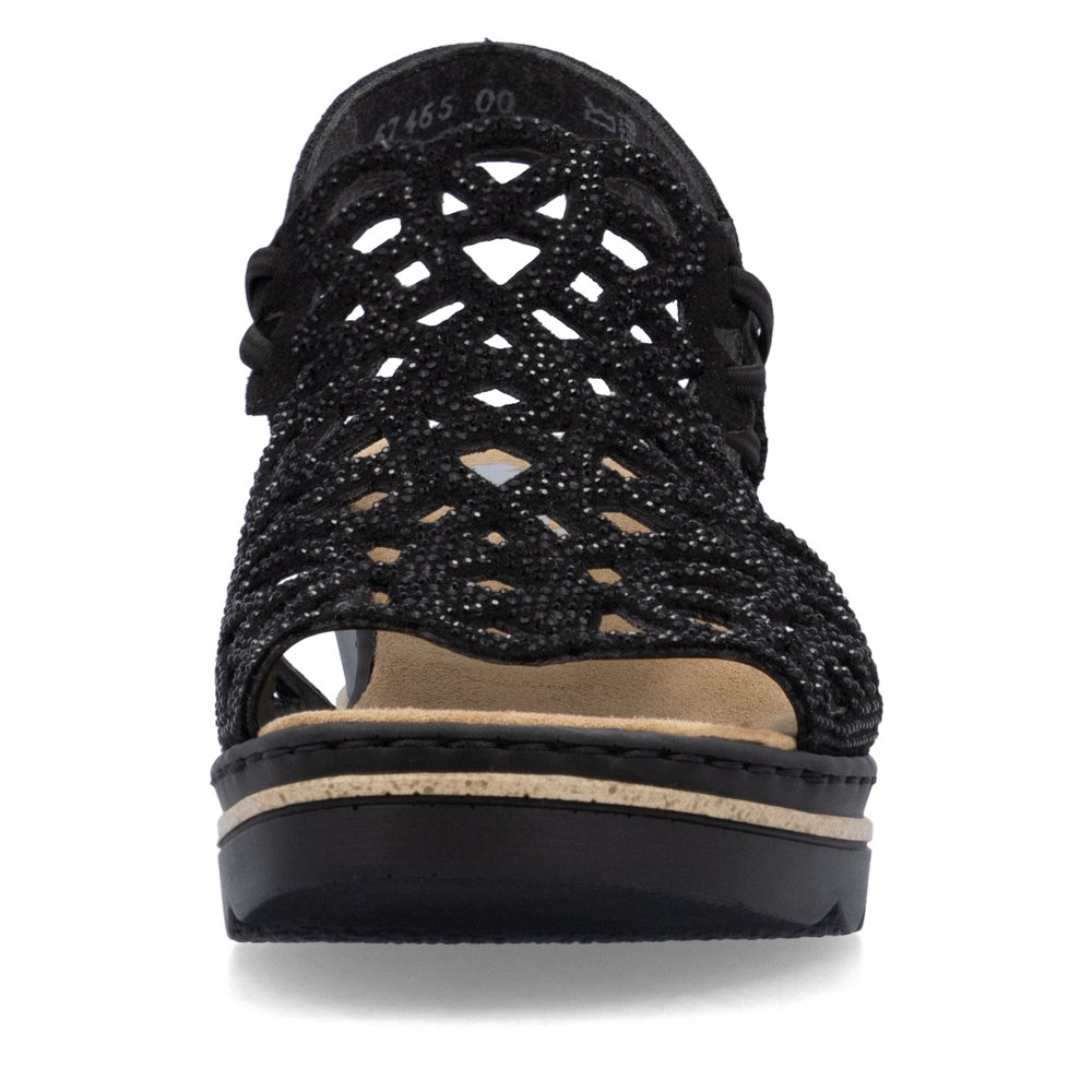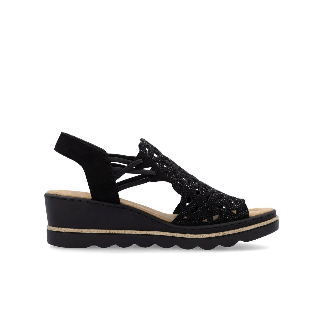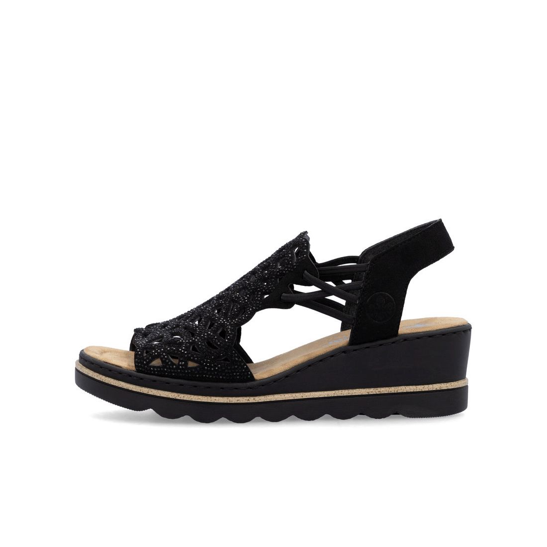 Milujete módu a maximální pohodlí? Tyto dámské sandály Rieker v černé barvě splňují vše. Flexibilní podešev se přizpůsobí každému kroku, tlumí nárazy a chrání páteř. Zajímavě perforovaný svršek je doplněn třpytivými kamínky. Gumičky na obou stranách se dokonale přizpůsobí šíři Vašeho chodidla. Vyražte si užít volný čas v pohodlí této obuvi. Technologie: Antistress - podešev je díky této technologii lehká, flexibilní, absorbuje nárazy při došlapu a snadno se přizpůsobí každé noze.