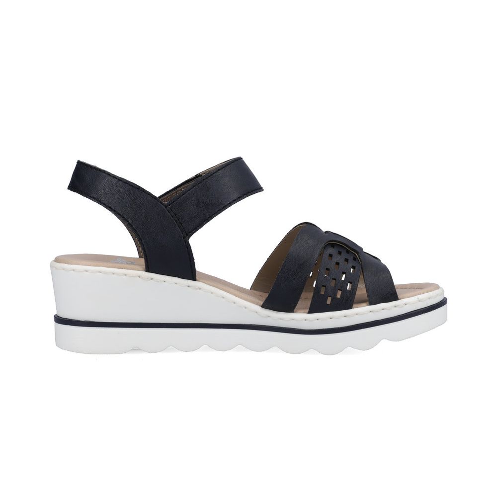 Detailní informace Modro-bílé dámské letní sandály Rieker jsou výbornou volbou. Jsou pohodlné díky stabilnímu klínku, který tlumí nárazy a otřesy, tím chrání páteř, oceníte také měkkou koženou stélku. Pásky na nártu jsou zajímavě proplétané, další pásek kolem nohy, je na suchý zip, pro snadné a rychlé obouvání. Tato barevná kombinace se skvěle hodí, jak k riflím, tak k šatům a sukni.