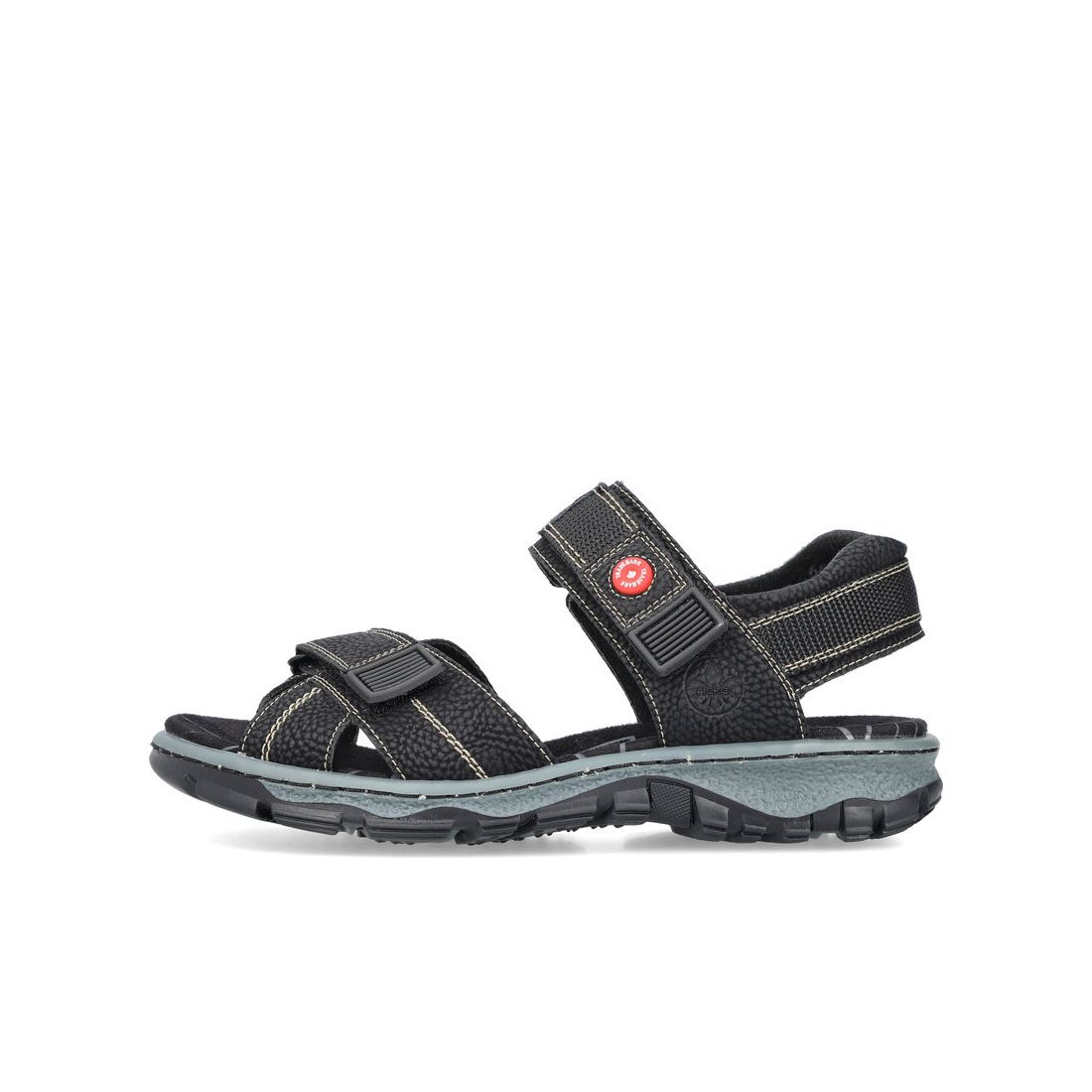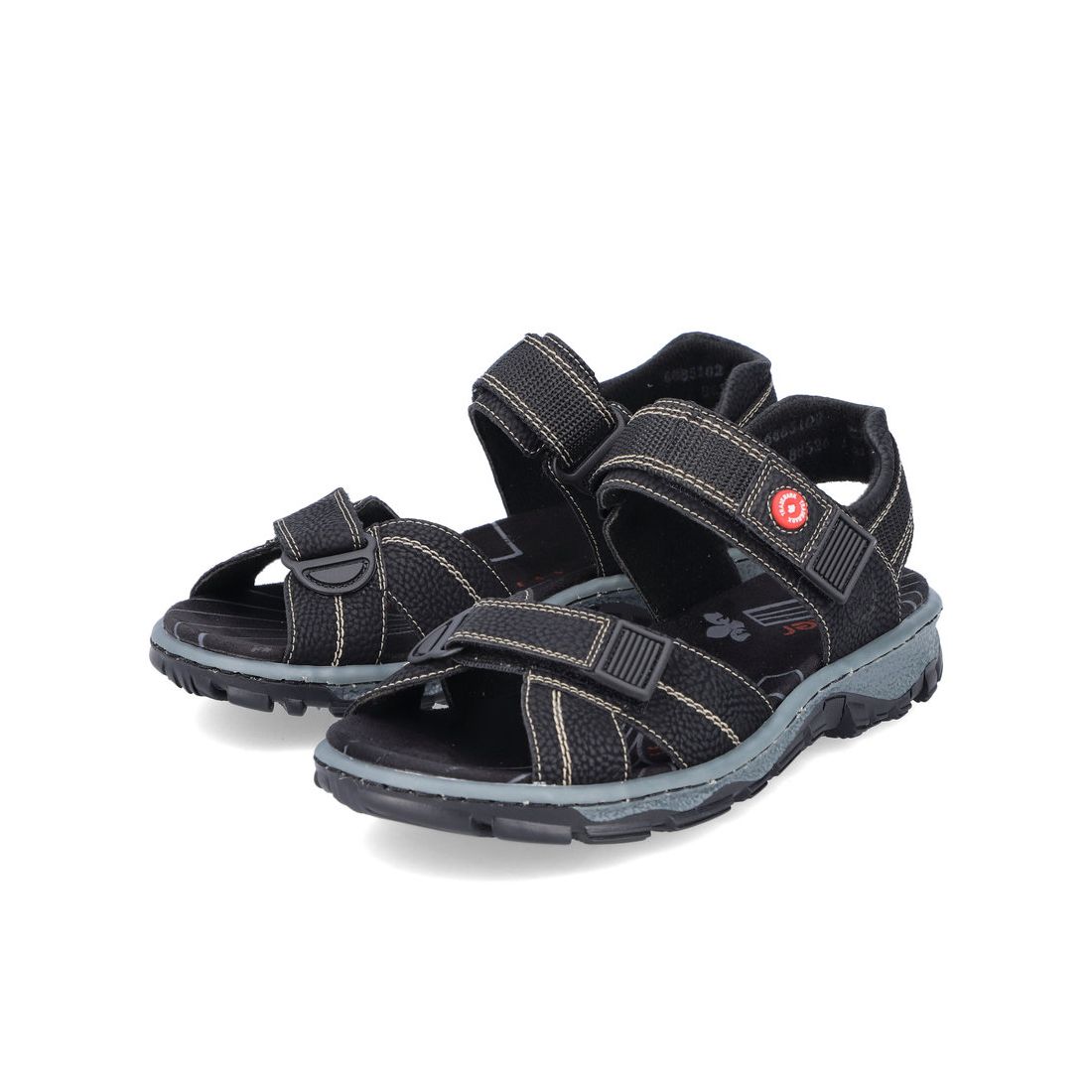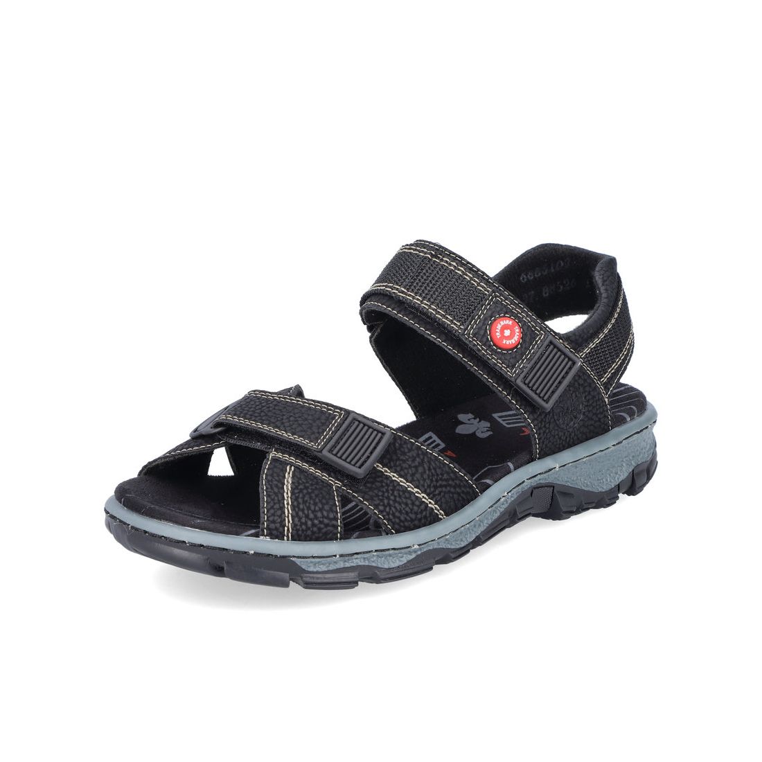 Dámské sportovní sandály od značky Rieker v černé barvě. Dva přední pásky jsou nastavitelné díky suchému zipu. Můžete si tak šířku obuvi přizpůsobit podle svých potřeb. Příjemně měkká stélka zajistí pohodlný došlap při každém kroku. Tyto sandále si rychle oblíbíte pro svoji funkčnost a pohodlnost. Technologie: Antistress - podešev je díky této technologii lehká, flexibilní, absorbuje nárazy při došlapu a snadno se přizpůsobí každé noze. Výrobní způsob - šitá obuv.