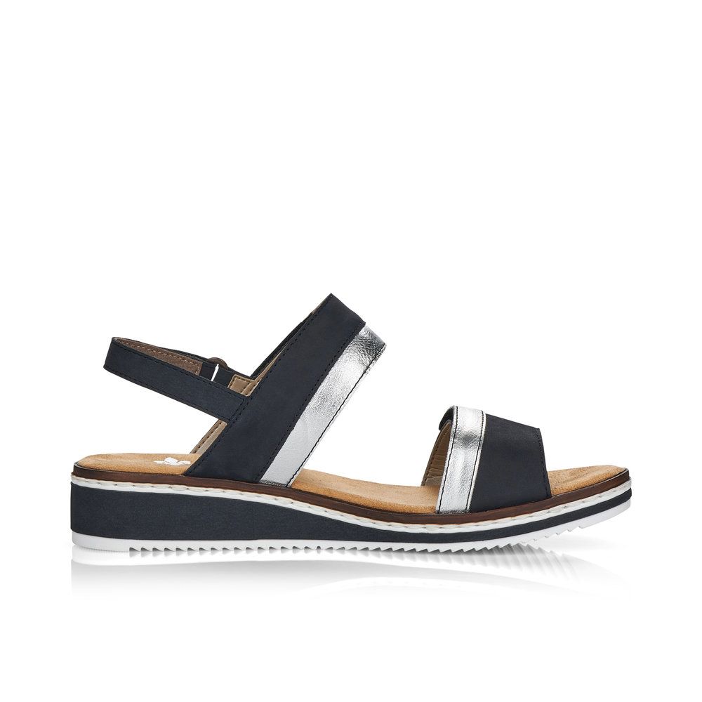 Skvělý kousek pro letní dny jsou tyto dámské sandály Rieker v modré barvě se stříbrnými proužky na páscích. Dva široké pásky a úzký za patou jsou na suchý zip, takže si obuv perfektně přizpůsobíte svým nohám. Pohodlný klínek Vám dodá jistý krok. Tyto boty si zamilujete a budete je ráda nosit každý den. Technologie: Antistress - podešev je díky této technologii lehká, flexibilní, absorbuje nárazy při došlapu a snadno se přizpůsobí každé noze.