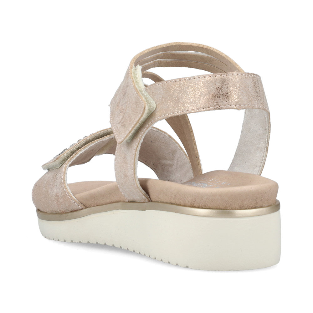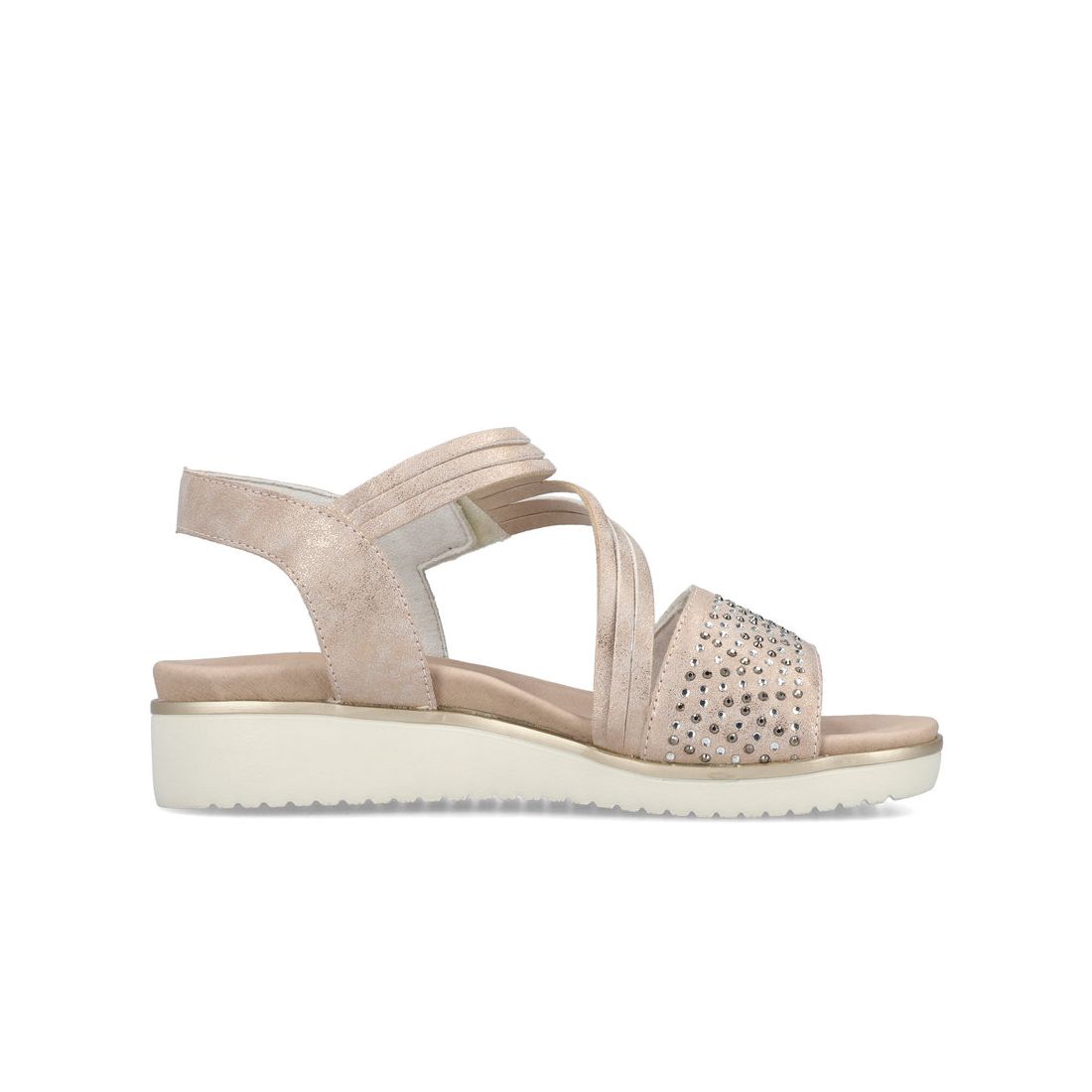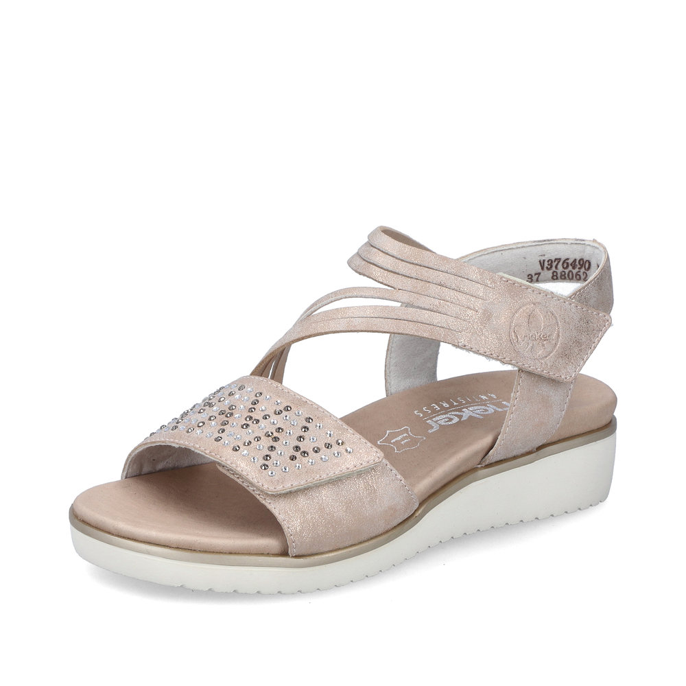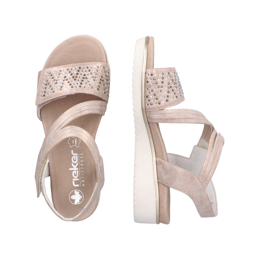 Dámské letní sandály Rieker, v jemně růžové barvě, doladí Váš celkový outfit do práce nebo ve volném čase. Tyto boty mají široký pásek na suchý zip ozdobeny kamínky. Snadné obouvání Vám dopřeje pásek na suchý zip. Pohodlná měkká stélka a flexibilní podešev Vám zpříjemní každý krok. Technologie: Antistress - podešev je díky této technologii lehká, flexibilní, absorbuje nárazy při došlapu a snadno se přizpůsobí každé noze. Výrobní způsob - lepená obuv.