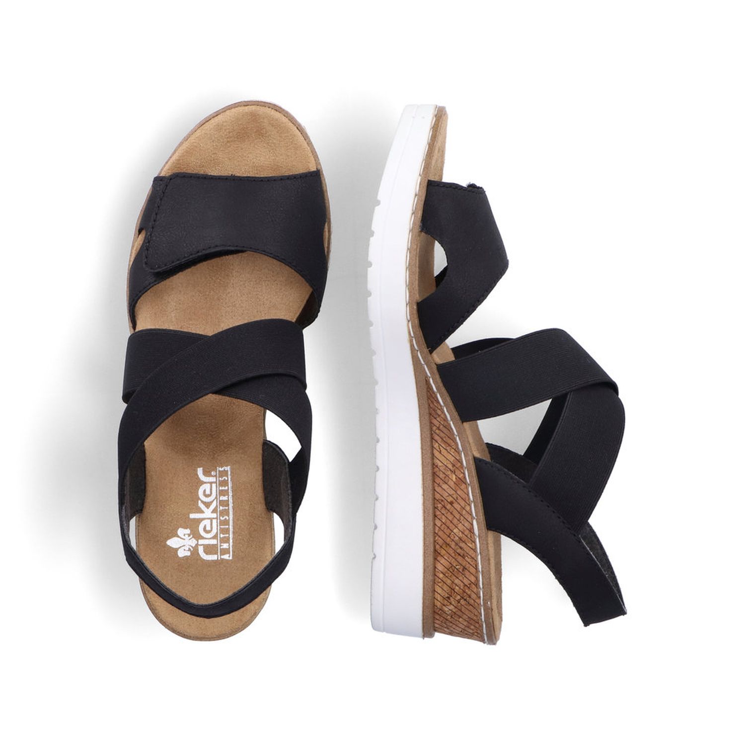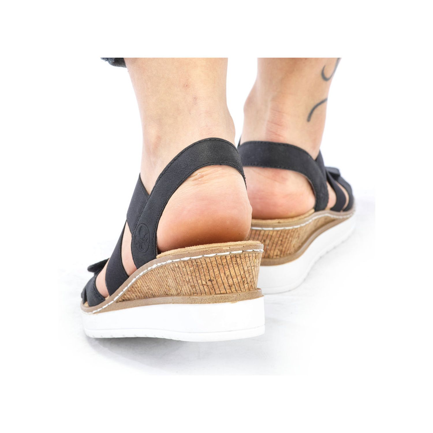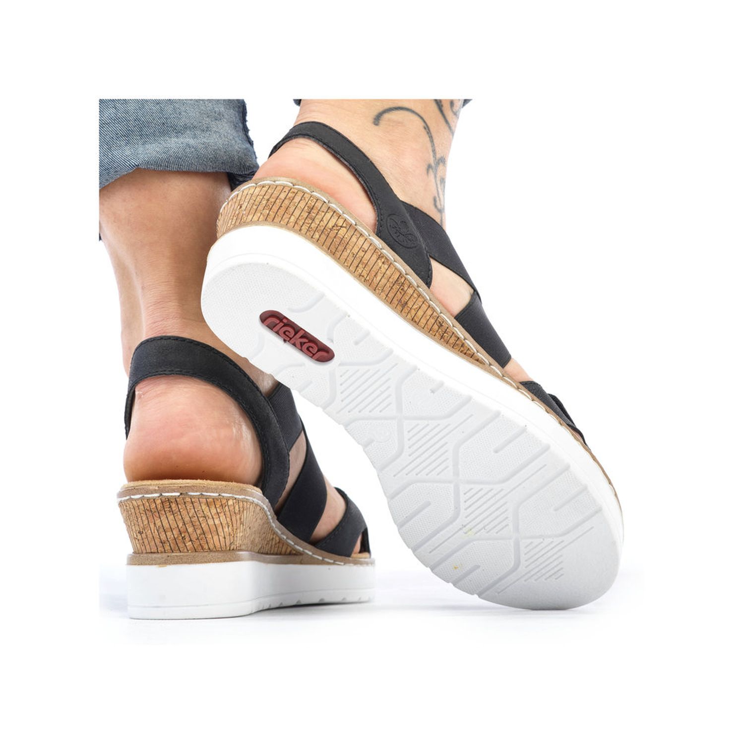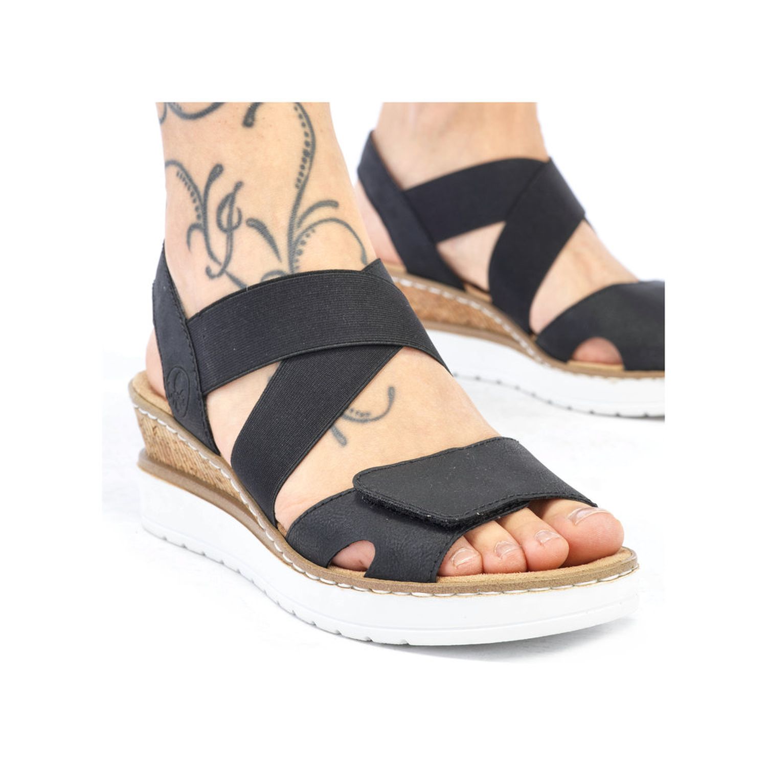 Tyto dámské letní sandálky Rieker jsou velmi povedený model. Svou barevnou a materiálovou kombinací působí sportovně elegantně. Unosíte je tedy k jakémukoliv outfitu. Díky suchému zipu a pružným gumičkám si obuv snadno obujete a přizpůsobíte svým nohám. Zajímavě řešený klínek podtrhne celkový vzhled obuvi. Tyto boty si můžete vzít jak do práce, tak na procházky městem. Technologie: Antistress - podešev je díky této technologii lehká, flexibilní, absorbuje nárazy při došlapu a snadno se přizpůsobí každé noze.