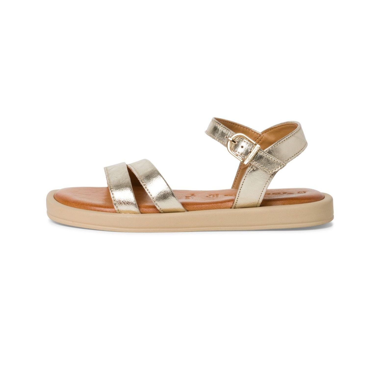 Detailní informace Páskové kožené letní dámské sandály Tamaris, ve zlaté barvě, se Vám určitě budou hodit. Tyto boty mají pohodlnou podešev a koženou stélku z paměťové pěny, která Vás bude hýčkat na každém kroku. Díky přesce si obuv přizpůsobíte svým nohám. Jednoduchý a přitom výrazný model doladí Váš letní outfit k dokonalosti.