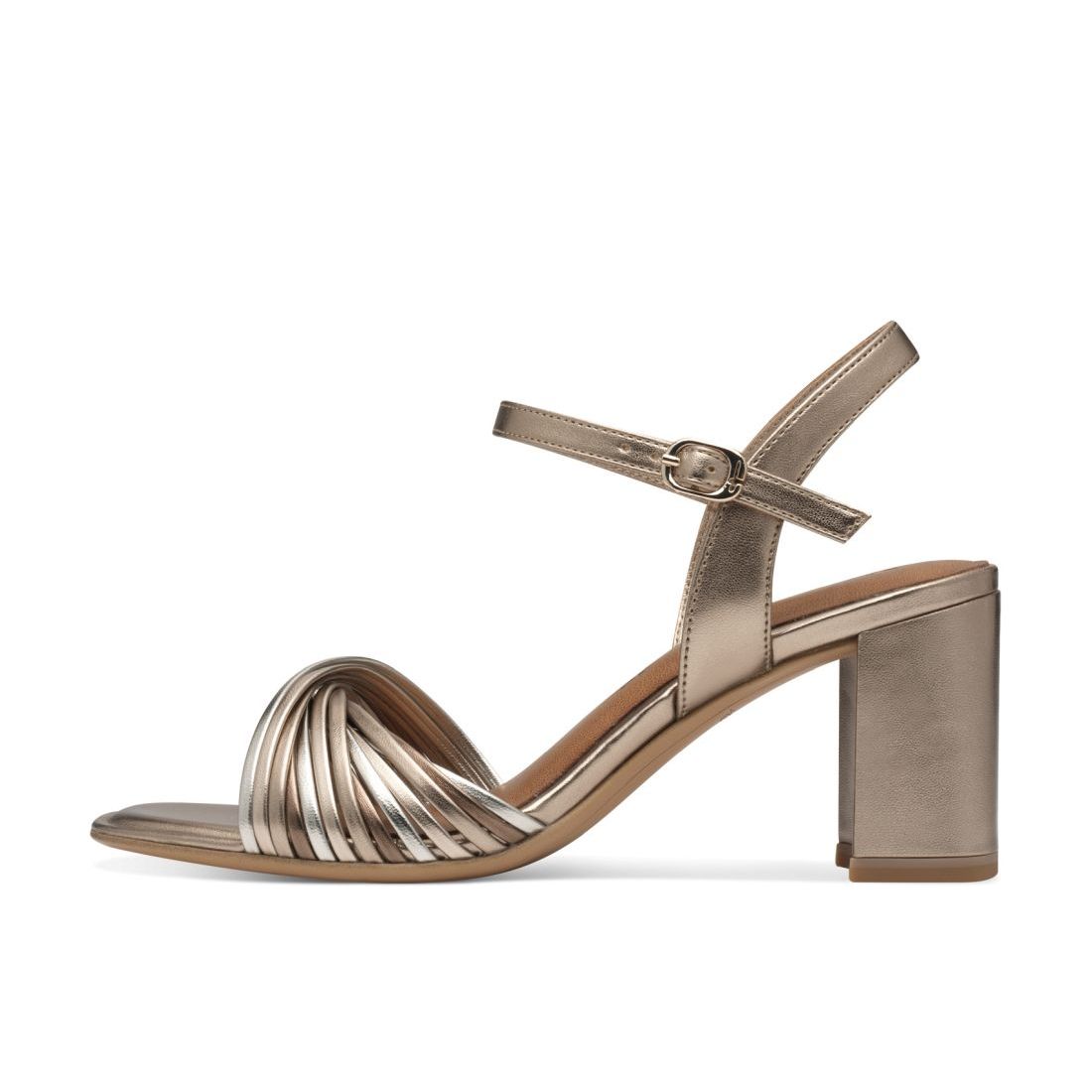 Detailní informace Tyto jemné letní sandály Tamaris, v bronzové barvě, se Vám budou hodit k jakémukoliv oblečení do práce, do společnosti nebo ve volném čase. Tento model má úzké pásky přes prsty a pásek kolem nohy s přezkou díky níž si obuv přizpůsobíte svým potřebám. Vyšší široký stabilní podpatek podtrhe Vaši ženskost. Oceníte pohodlnou koženou stélku z paměťové pěny, která Vám dodá pohodlí na každém kroku. Tyto sandály jsou skvělou volbou.