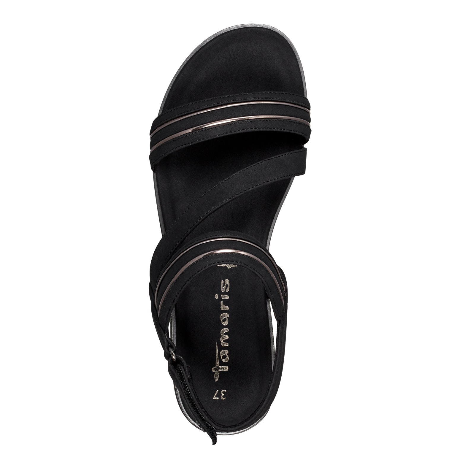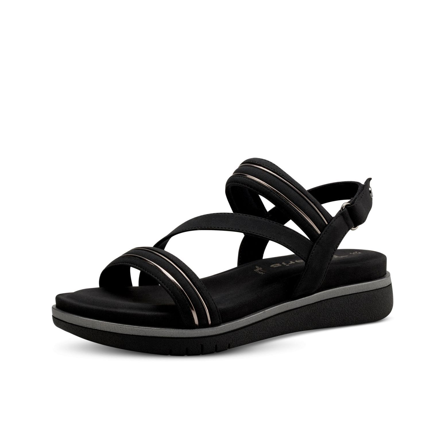 Detailní informace Nádherné sportovně elegantní dámské sandály Tamaris v černé barvě, jsou doladěny lesklými aplikacemi na páscích. Celkový vzhled doladí šedý proužek na podešvi. Snadno si obuv obujete díky pásku za patou na suchý zip. Tento model Vám nabízí pohodlí, které potřebujete, mají totiž stélku z paměťové pěny. S lehkostí vyražte za novými dobrodružstvími každého dne.
