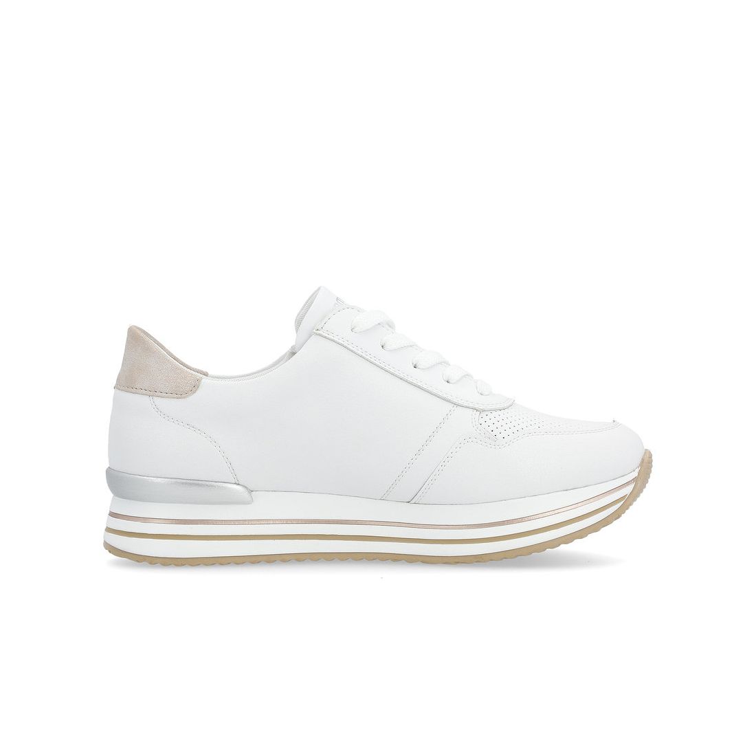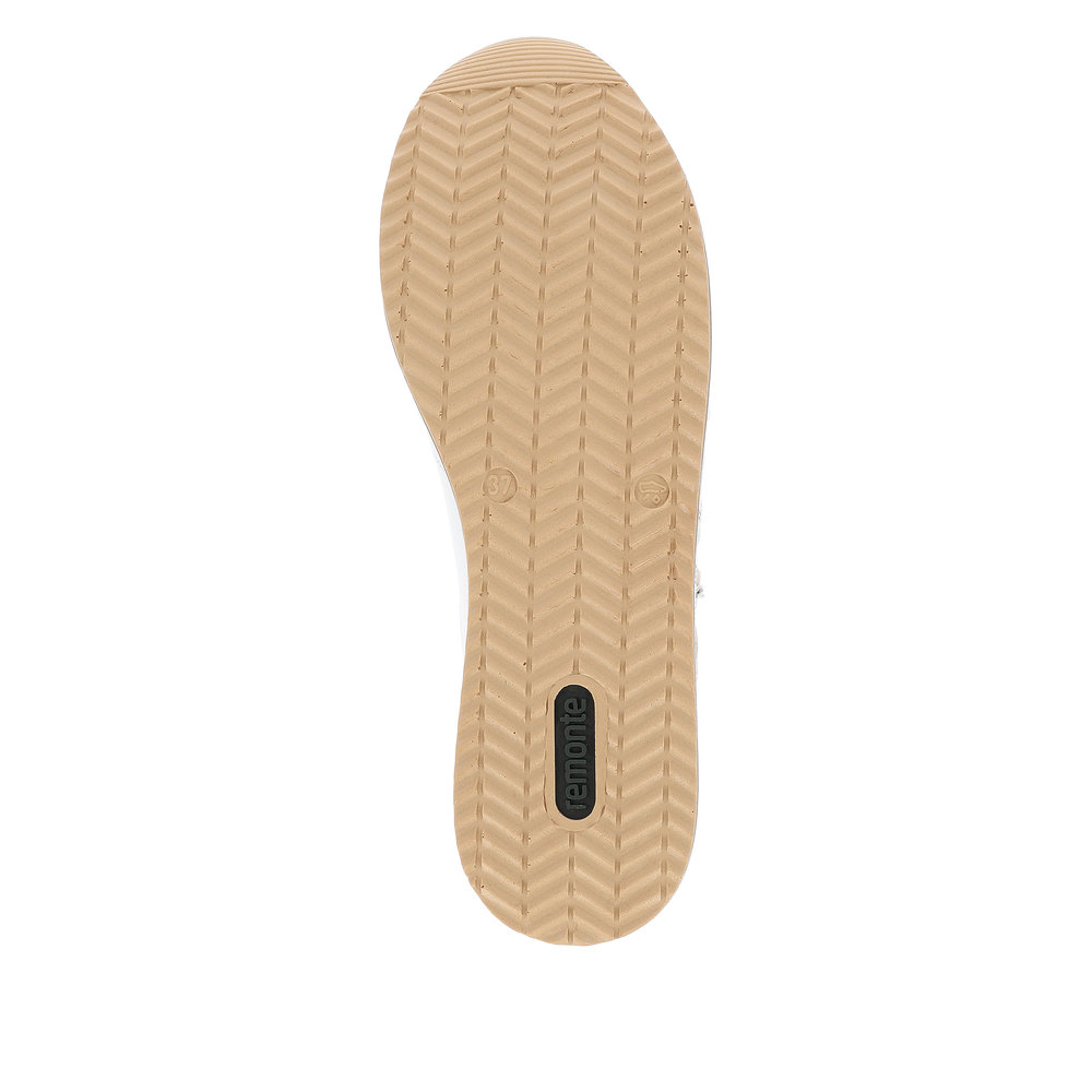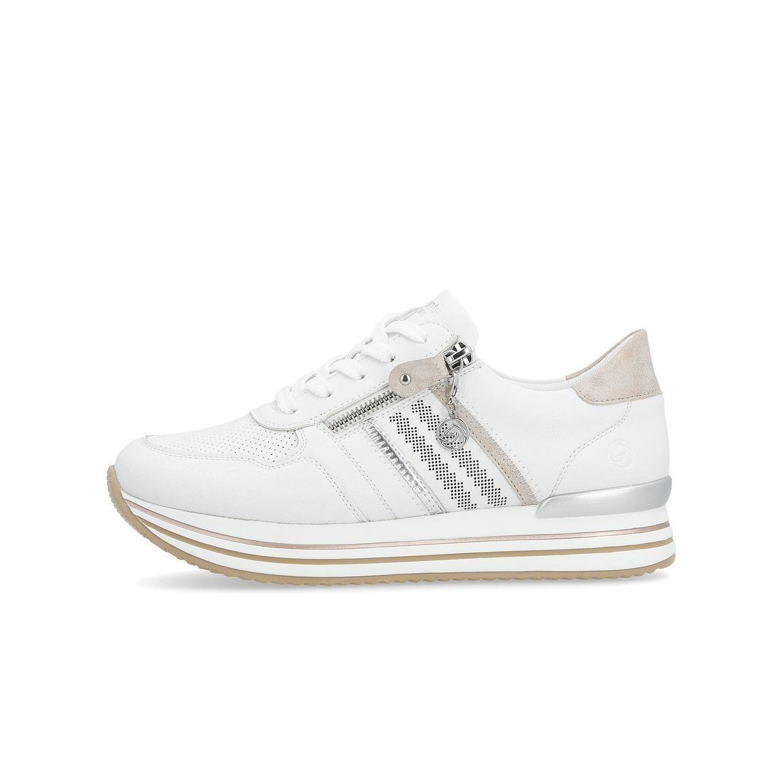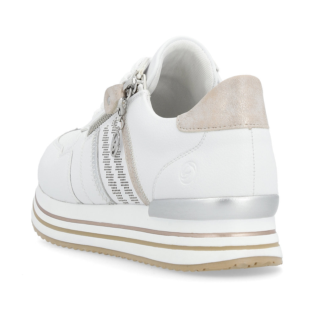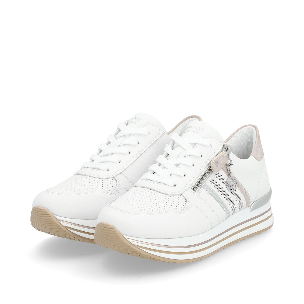 Pohodlné tenisky Remonte v bílé barvě jsou doladěny metalickými prvky, funkčním zipem a ozdobou. Celkový vzhled je doladěn vyšší podešví. Jednoduché obouvání Vám zajistí zip a tkaničky, díky kterým si obuv přizpůsobíte svým potřebám. Měkká vyjímatelná stélka Vás bude hýčkat na každém kroku. Rifle a riflová sukně se budou k těmto teniskám určitě hodit. Technologie: RemonteSoft - patentovaná technologie stélky z paměťové pěny, která se perfektně přizpůsobí tvaru Vašeho chodidla. Vyjímatelná stélka. Výrobní způsob - lepená obuv.