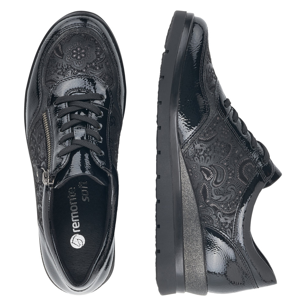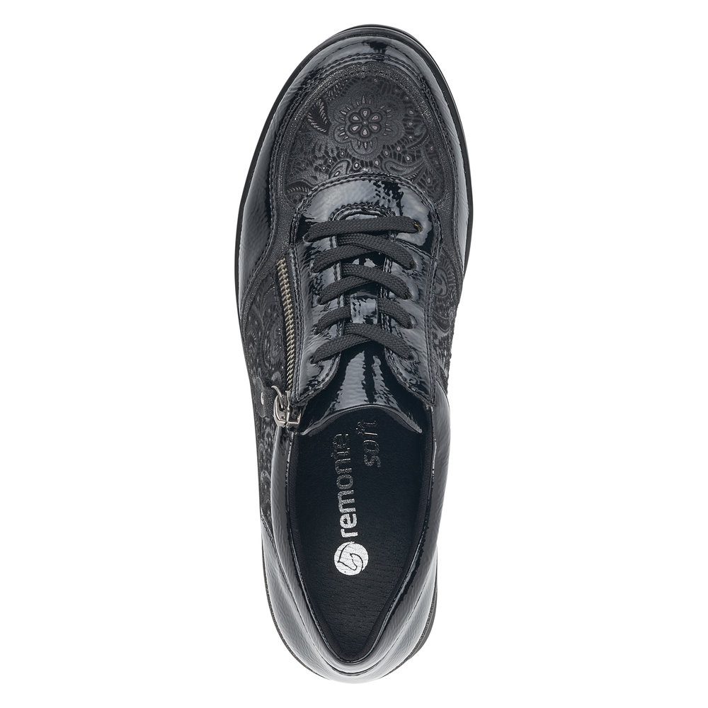 Moderní dámské tenisky Remonte, v černé barvě, zaujmou na první pohled jemným vzorem a lesklým materiálem. Funkční zip Vám zajistí snadné obouvání a tkaničky pomohou si obuv ještě lépe přizpůsobit svým potřebám. Pohodlná měkká stélka z paměťové pěny lze vyndat, vyvětrat nebo vyměnit za ortopedickou. S těmito botami zazáříte a budete se v nich cítit skvěle.