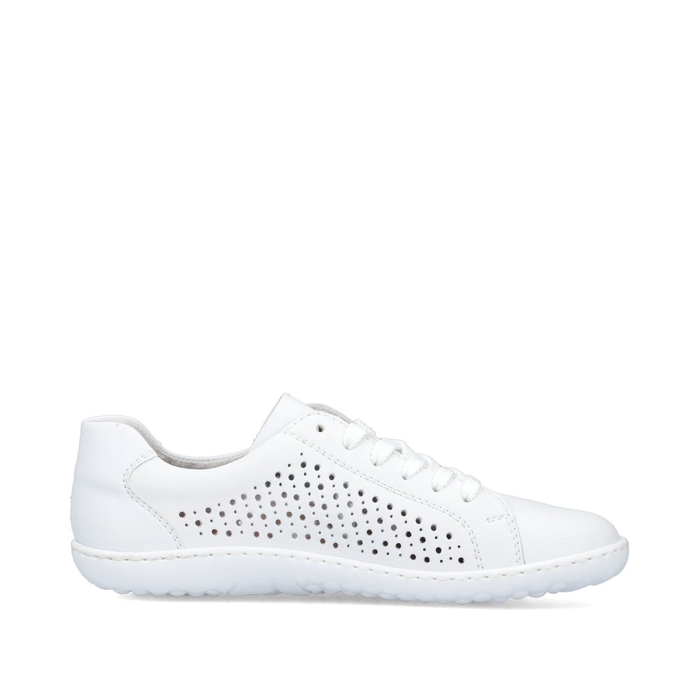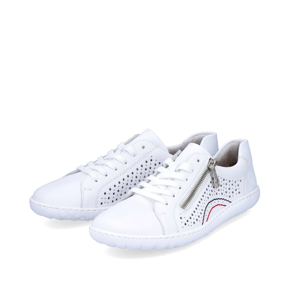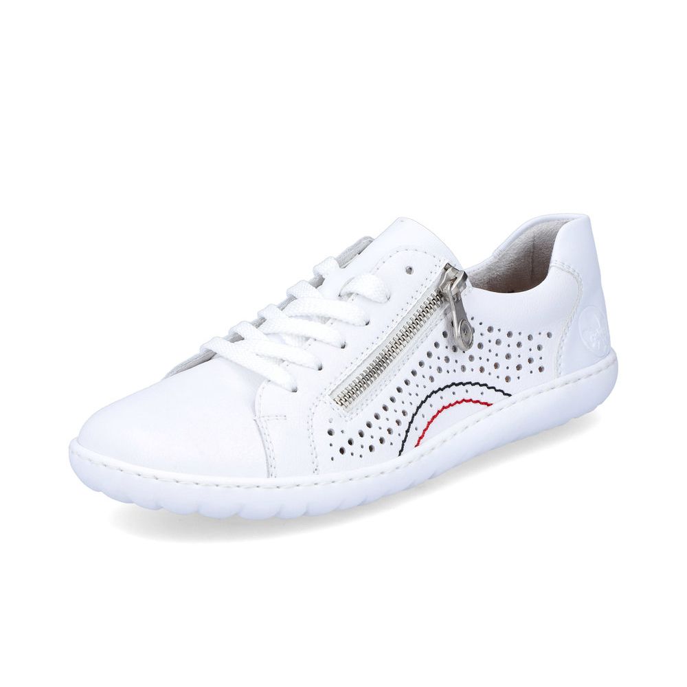 S tímto modelem neuděláte krok vedle. Tyto krásné dámské kožené tenisky Rieker v bílé barvě si zamilujete. Pomocí tkaniček si obuv přizpůsobíte svým nohám a díky funkčnímu zipu si obuv rychle a snadno obujete. Obuv je vzdušná díky perforaci, a tak se v ní budete cítit skvěle po celý den. Tento model snadno sladíte k sukni, šatům, riflím nebo kraťasům a můžete vyrazit kamkoliv. Technologie: Antistress - podešev je díky této technologii lehká, flexibilní, absorbuje nárazy při došlapu a snadno se přizpůsobí každé noze.