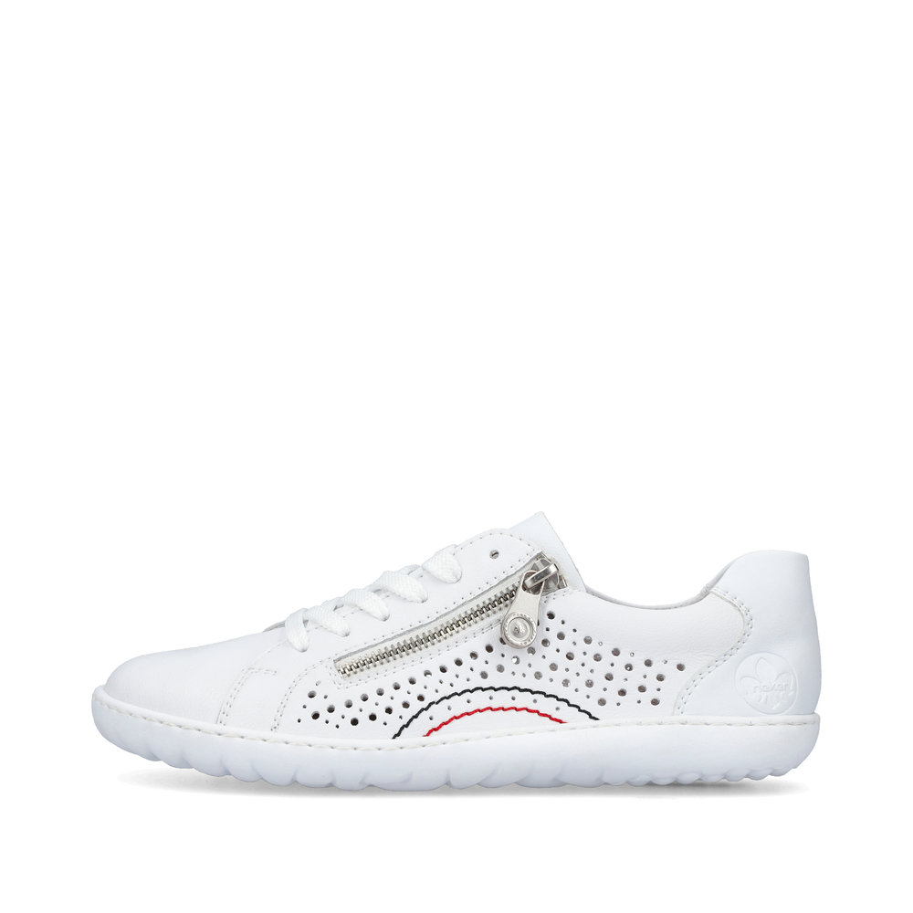 Detailní informace S tímto modelem neuděláte krok vedle. Tyto krásné dámské kožené tenisky Rieker v bílé barvě si zamilujete. Pomocí tkaniček si obuv přizpůsobíte svým nohám a díky funkčnímu zipu si obuv rychle a snadno obujete. Obuv je vzdušná díky perforaci, a tak se v ní budete cítit skvěle po celý den. Tento model snadno sladíte k sukni, šatům, riflím nebo kraťasům a můžete vyrazit kamkoliv.