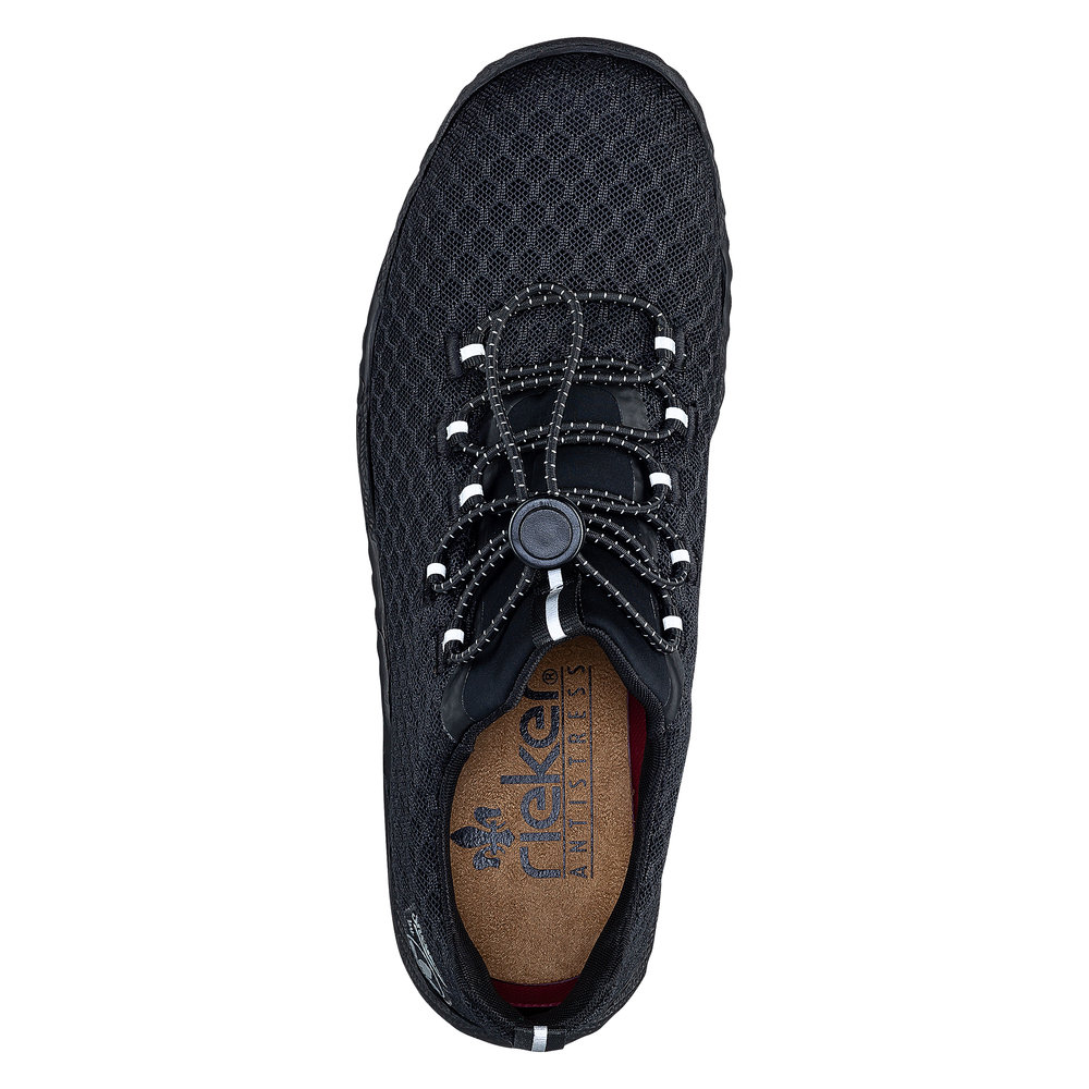 Pohodlné dámské sportovní polobotky v černé barvě od značky Rieker. Tyto boty jsou ideální volbou na celodenní výšlap. Moderní vzhled, vzdušnost, lehkost a pohodlnost, to jsou vlastnosti, které této obuvi dominují! Textilní (síťovaný) svršek, pohodlná měkká vyjímatelná stélka a kvalitní podešev s technologií Antistress, která perfektně tlumí při došlapu nárazy a otřesy a šetří tak tlak na Vaše nohy a páteř. Co víc si může každá žena přát. Zkuste je a uvidíte sama….! Technologie: Antistress - podešev je díky této technologii lehká, flexibilní, absorbuje nárazy při došlapu a snadno se přizpůsobí každé noze. Vyjímatelná měkká stélka