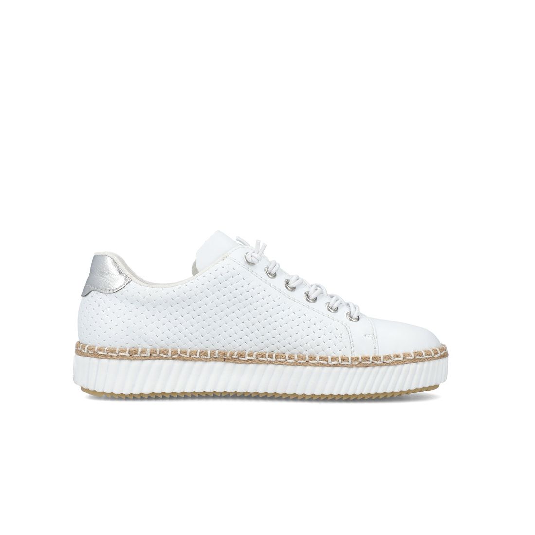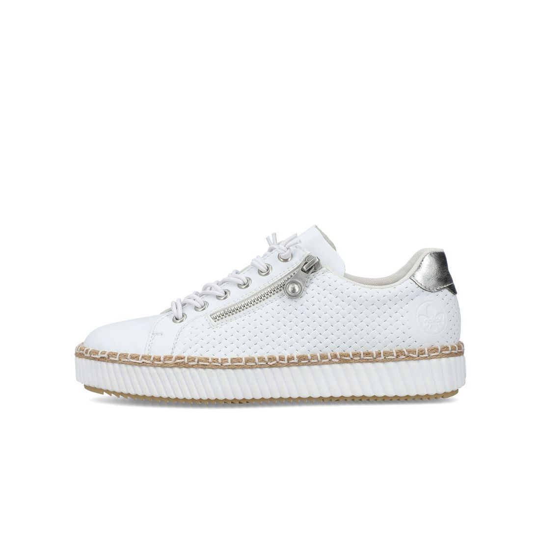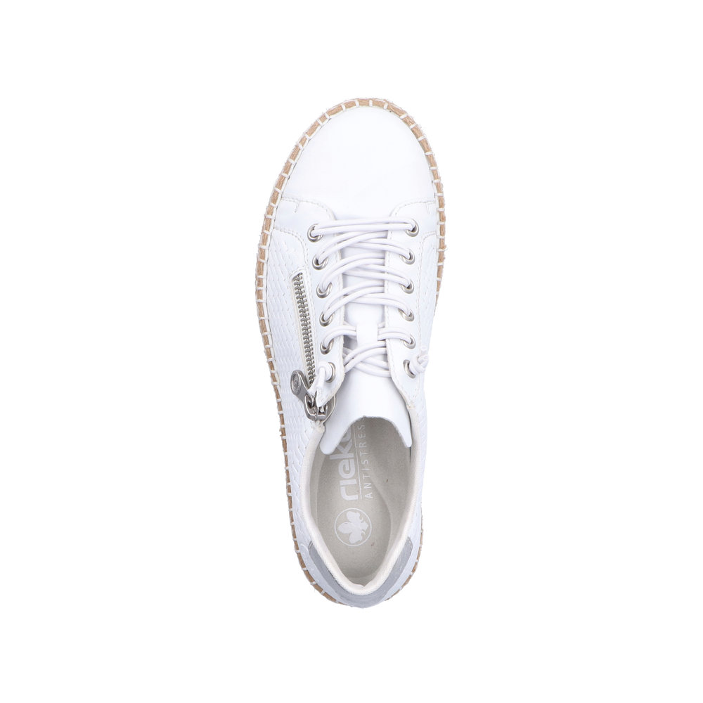 Kožené dámské tenisky Rieker v bílé barvě s jemným perforováním si zamilujete. Pomocí gumových tkaniček si obuv přizpůsobíte svým nohám. Funkční zip Vám zajistí pohodlné obouvání. Kožený vrchní materiál a vyjímatelná měkká stélka, jsou zárukou pohodlí. Flexibilní podešev se přizpůsobí každému kroku a tlumí nárazy, tím chrání páteř. Jemné perforování doladí celkový vzhled tohoto modelu, který lehce sladíte s letními šaty, kraťasy nebo kalhotami a budete vypadat prostě skvěle. Technologie: Antistress - podešev je díky této technologii lehká, flexibilní, absorbuje nárazy při došlapu a snadno se přizpůsobí každé noze. Vyjímatelná stélka