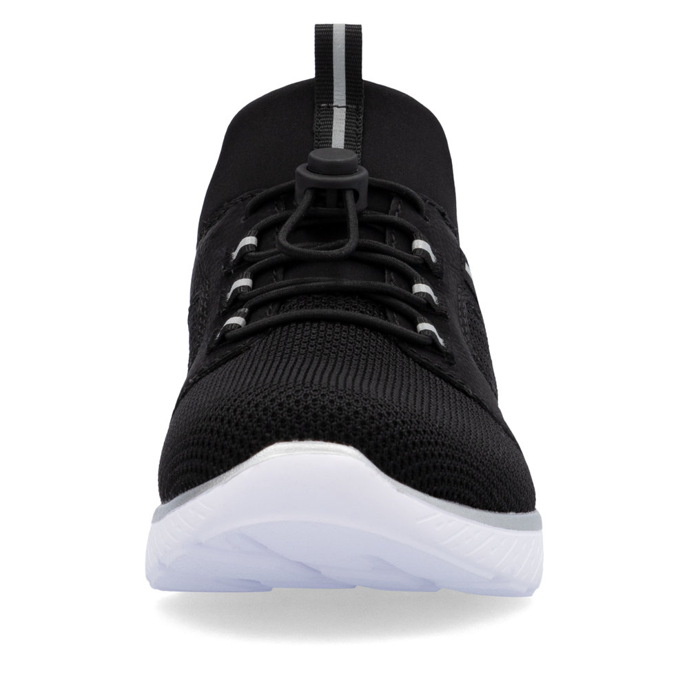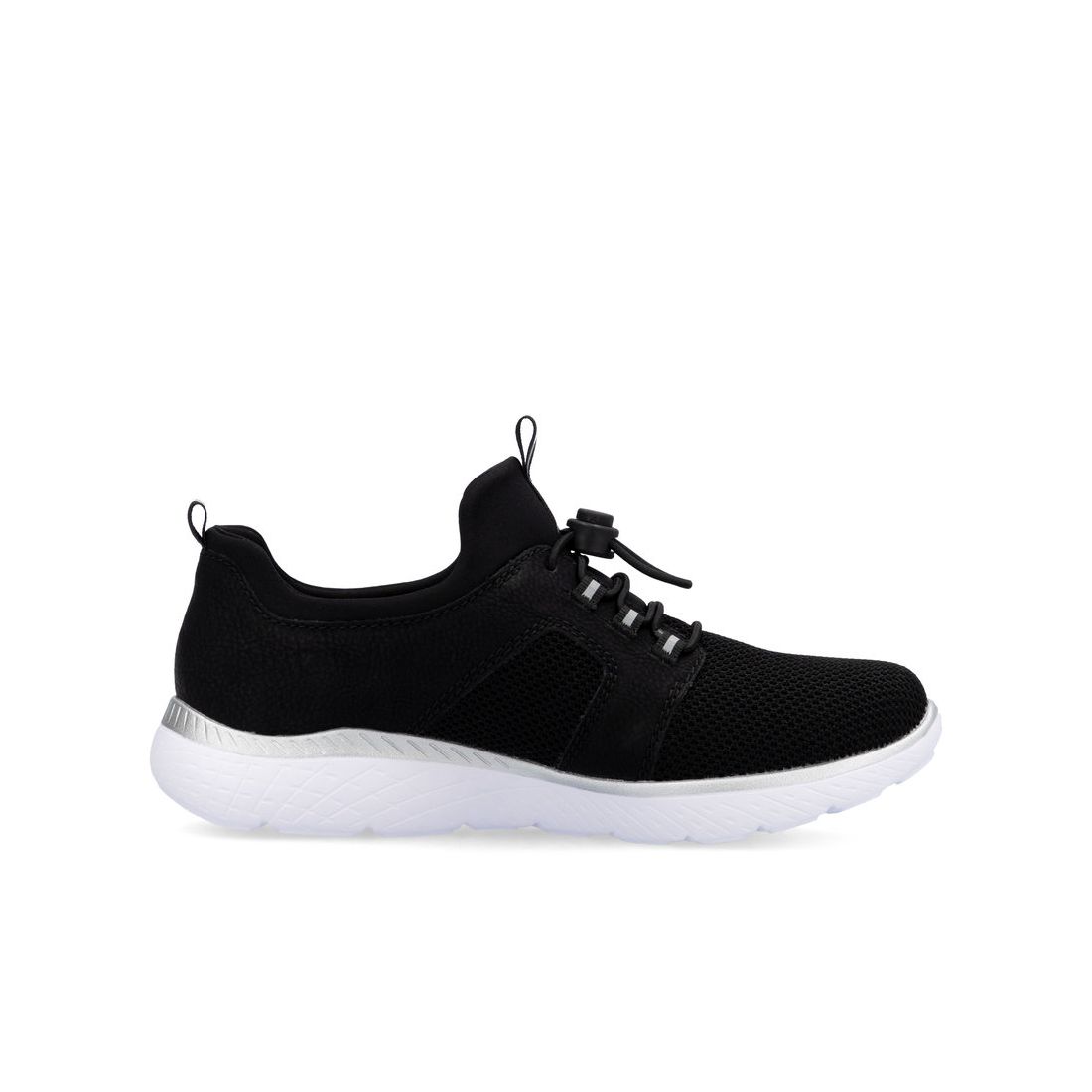 Tyto sportovní tenisky Rieker, černé barvy, musí mít každá moderní žena, která miluje pohyb. Černý textilní svršek je dozdoben kontrastně světlými aplikacemi a nápisem R. Snadné obouvání Vám nabídne pružný horní lem a utahování gumové tkaničky. Díky paměťové stélce MemoSoft a kvalitní podešvi s technologií Antistress budou Vaše chodidla jako v bavlnce. Technologie: Antistress - podešev je díky této technologii lehká, flexibilní, absorbuje nárazy při došlapu a snadno se přizpůsobí každé noze. MemoSoft - stélka s paměťovou pěnou, která se perfektně přizpůsobí tvaru Vaší nohy. Výrobní způsob - lepená obuv.