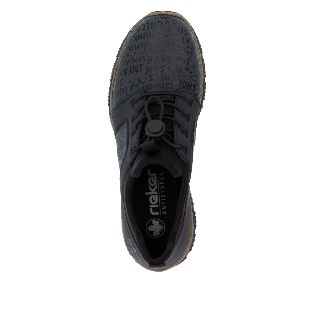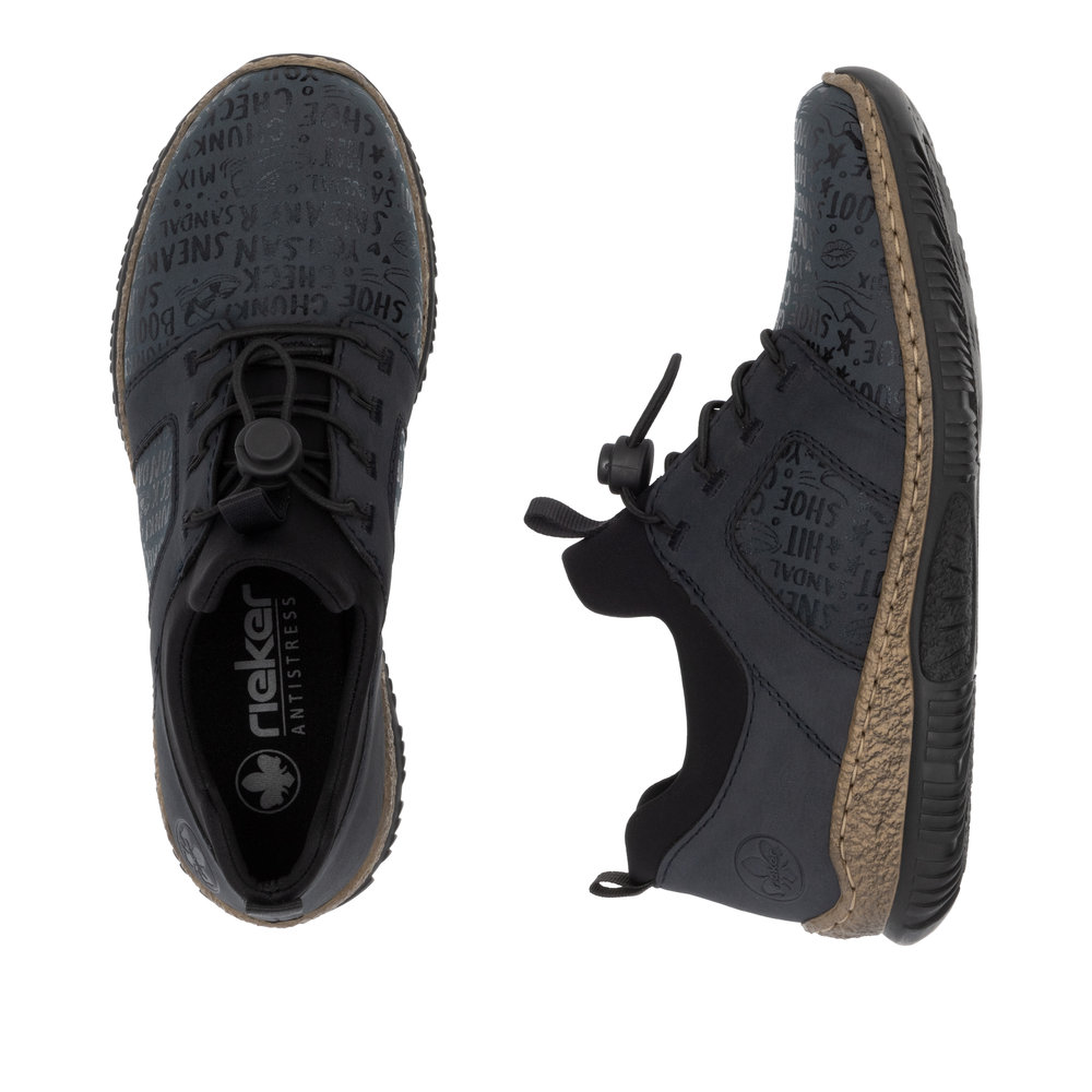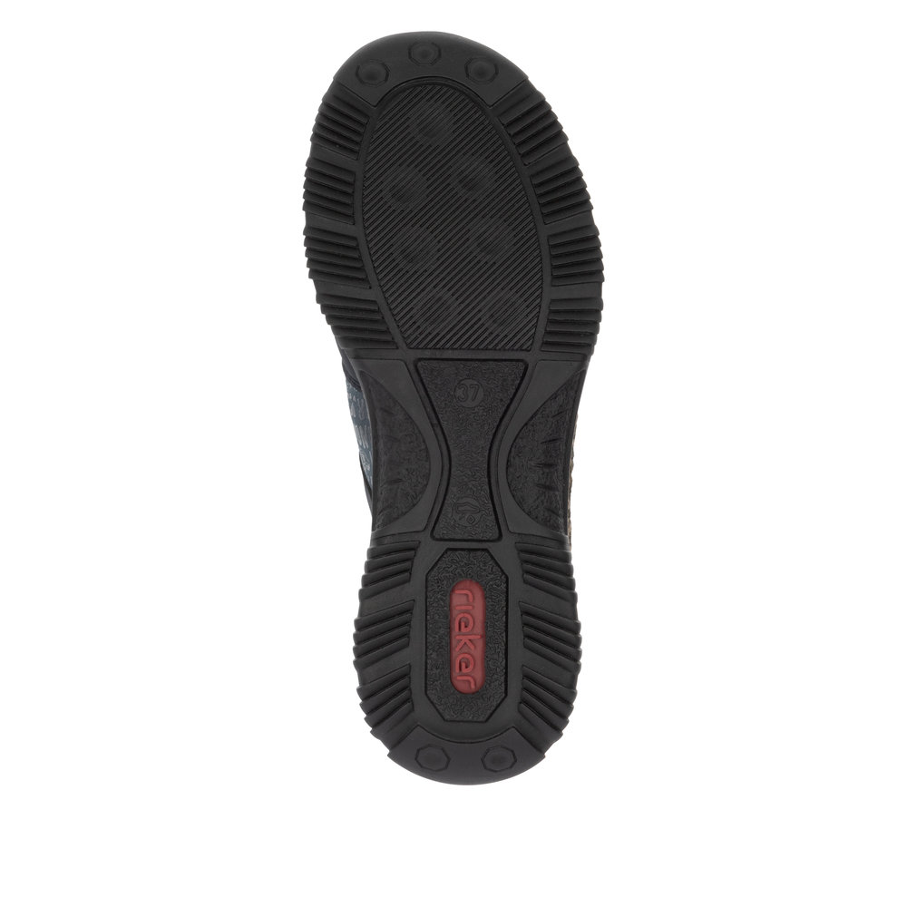 Moderně zpracované boty Rieker, které zaujmou svým nezaměnitelným vzhledem, na první pohled. Každá žena, která miluje módu a styl by je měla mít ve svém botníku. Na první pohled zaujme originální potisk v podobě loga značky. Díky pružnému hornímu lemu a šněrováním se stahovací gumičkou se Vám budou boty snadno obouvat. Maximální pohodlí Vám zajistí měkká paměťová stélka s technologií MemoSoft. Už víte k čemu si je vezmete? Technologie: Antistress - podešev je díky této technologii lehká, flexibilní, absorbuje nárazy při došlapu a snadno se přizpůsobí každé noze. MemoSoft -stélka je vyrobena z paměťové pěny, která se perfektně přizpůsobí tvaru Vašeho chodidla.