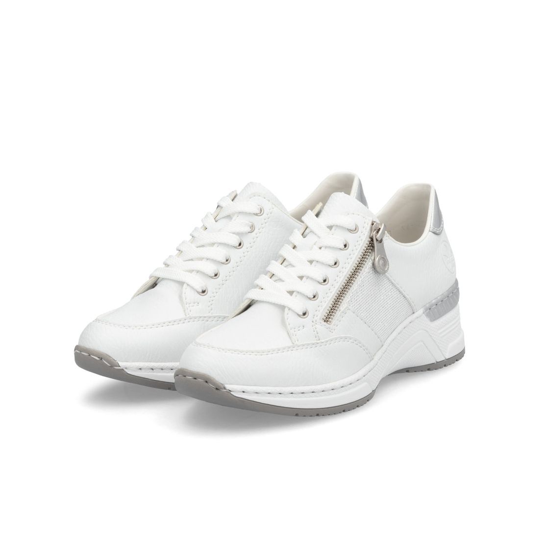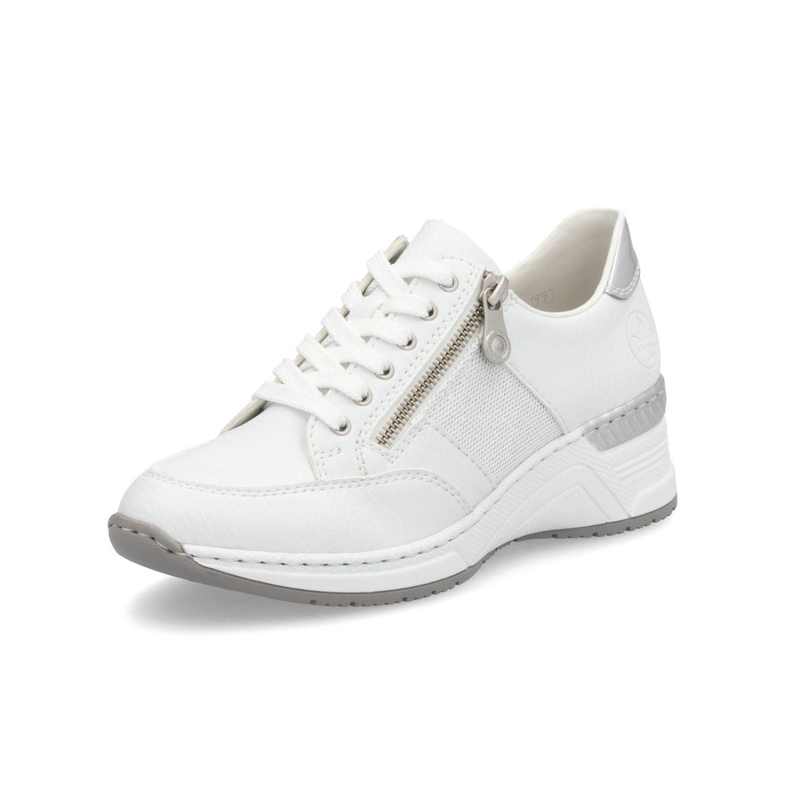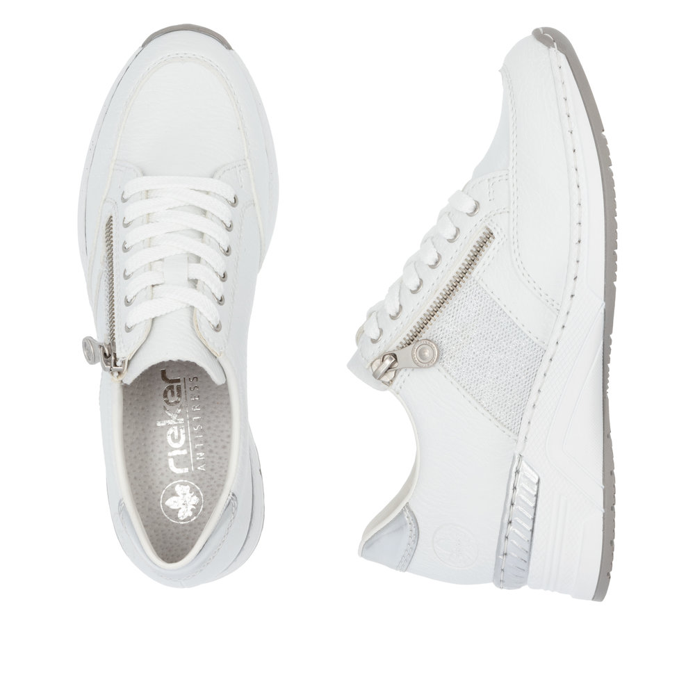Originální dámské tenisky Rieker v bílo-stříbrné kombinaci si zamilujete. Pomocí tkaniček si obuv přizpůsobíte svým nohám. V nártové části je umístěn funkční zip pro snadné obouvání. Maximální pohodlí Vám zajistí příjemně měkká stélka s kvalitní, flexibilní podešví, která se přizpůsobí každému kroku a tlumí nárazy, čím chrání páteř. Tyto boty snadno sladíte s kraťasy nebo kalhotami a budete vypadat prostě skvěle. Technologie: Antistress - podešev je díky této technologii lehká, flexibilní, absorbuje nárazy při došlapu a snadno se přizpůsobí každé noze. Vyjímatelná stélka. Výrobní způsob - šitá obuv.