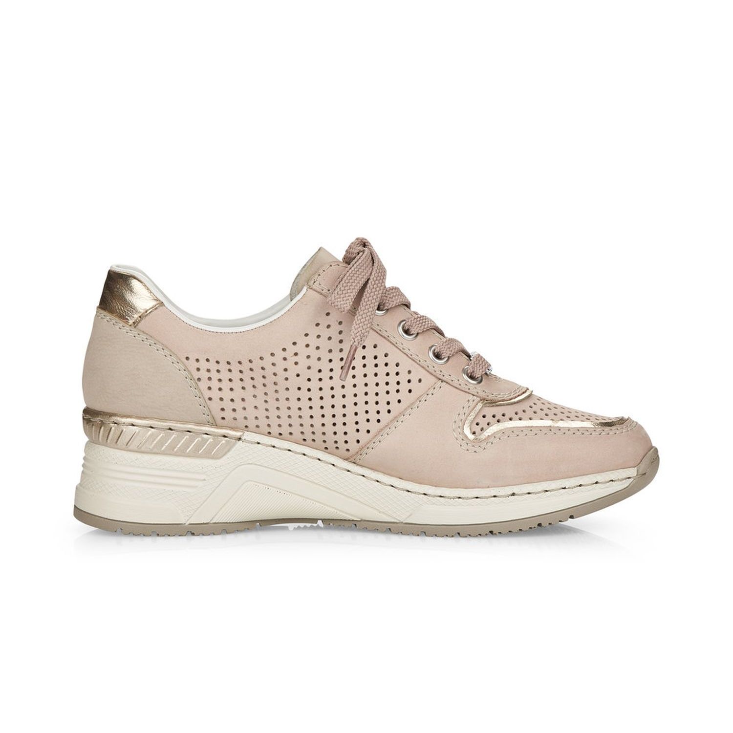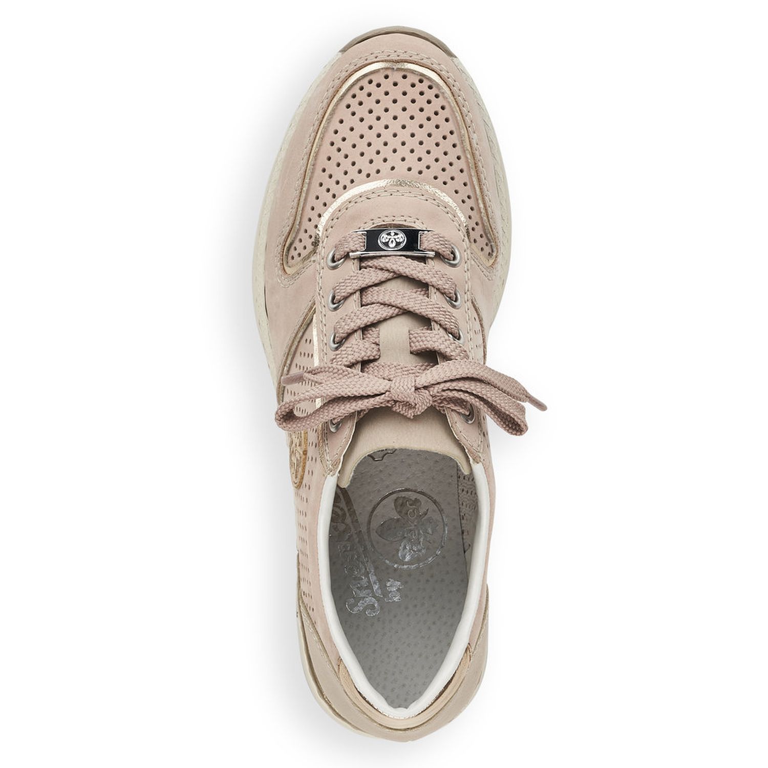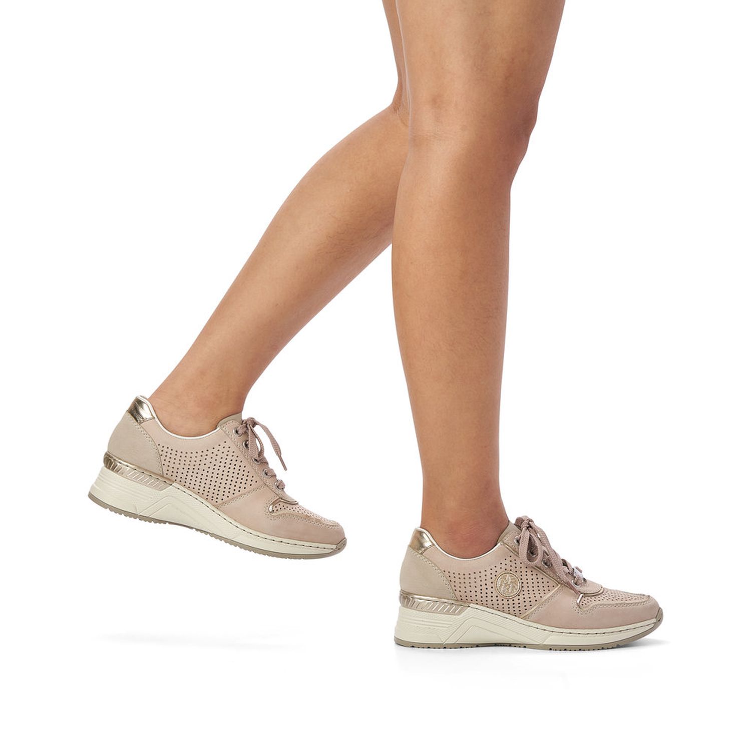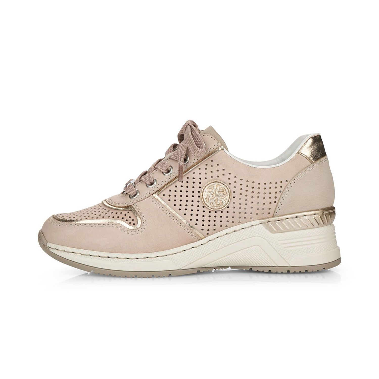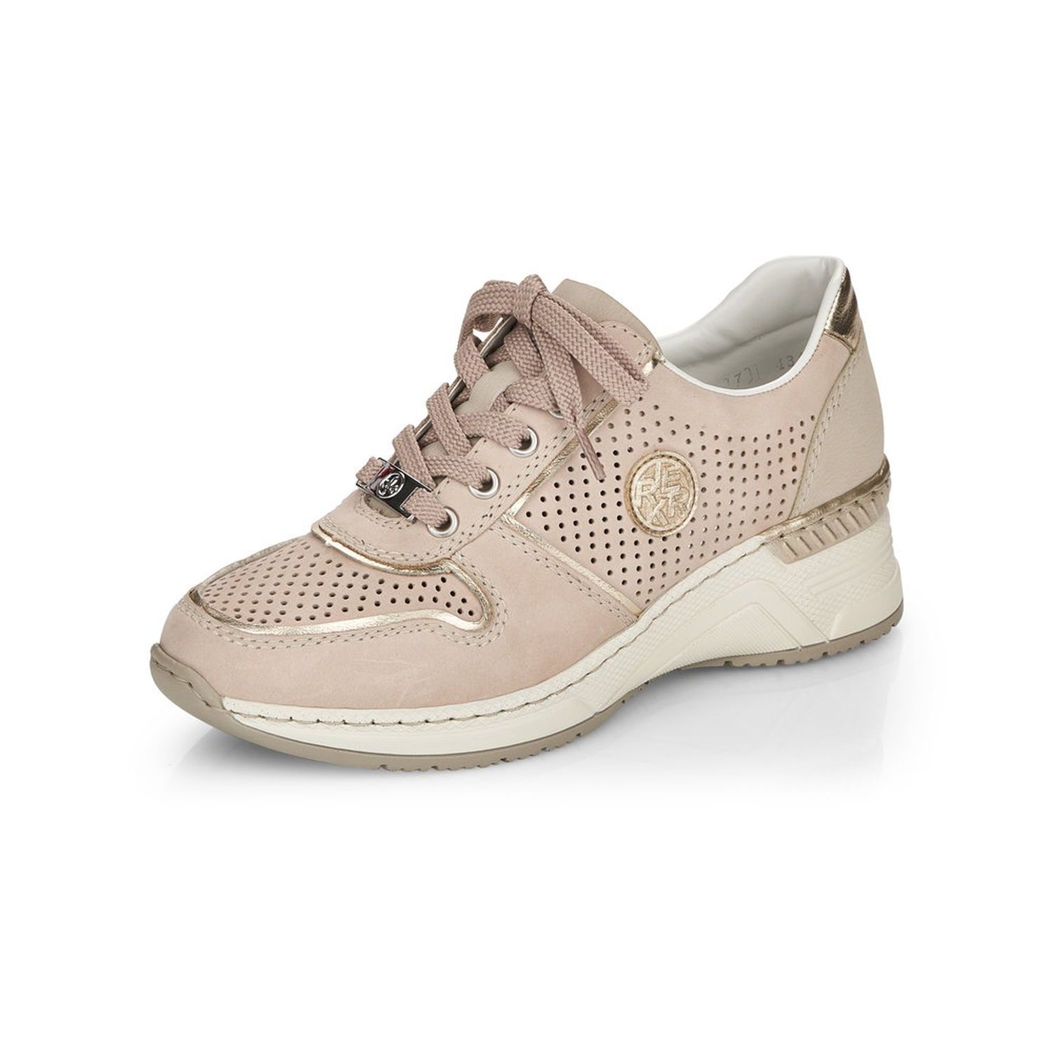 Dámské vycházkové tenisky Rieker v béžové barvě, jsou doladěny jemným lemováním, kovovou aplikací na tkaničkách a logem na vnější straně obuvi. Díky tkaničkám si šíři obuvi přizpůsobíte dle svých potřeb. Jemná perforace svršeku zajistí příjemné odvětrávání obuvi. Lehce vyvýšená podešev zvýrazní celkový vzhled obuvi a dodá vám stabilitu. Pohodlná vyjímatelná stélka a flexibilní podešev zpříjemní každý došlap a Vám zajistí skvělý pocit. Tyto boty lehce podtrhnou Váš celkový outfit. Podívejte se i na další barevnou kombinaci, kterou nabízíme na našem e-shopu. Technologie: Antistress - podešev je díky této technologii lehká, flexibilní, absorbuje nárazy při došlapu a snadno se přizpůsobí každé noze. Vyjímatelná stélka.