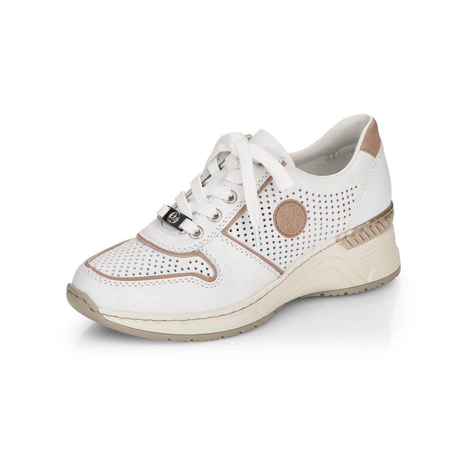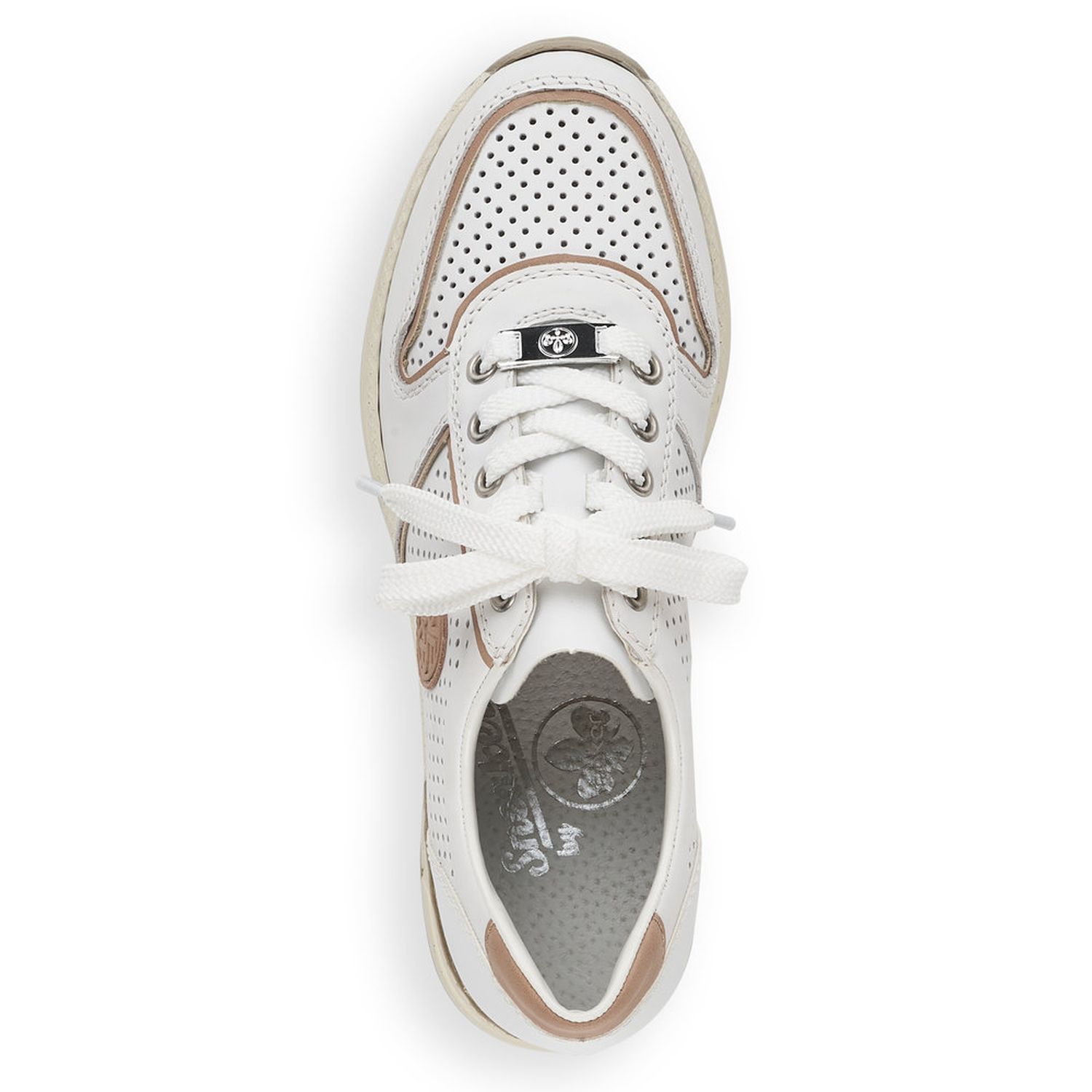 Dámské vycházkové tenisky Rieker v bílé barvě, jsou doladěny jemným lemováním, kovovou aplikací na tkaničkách a logem na vnější straně obuvi. Díky tkaničkám si šíři obuvi přizpůsobíte dle svých potřeb. Jemná perforace svršeku zajistí příjemné odvětrávání obuvi. Lehce vyvýšená podešev zvýrazní celkový vzhled obuvi a dodá vám stabilitu. Pohodlná vyjímatelná stélka a flexibilní podešev zpříjemní každý došlap a Vám zajistí skvělý pocit. Tyto boty lehce podtrhnou Váš celkový outfit. Podívejte se i na další barevnou kombinaci, kterou nabízíme na našem e-shopu. Technologie: Antistress - podešev je díky této technologii lehká, flexibilní, absorbuje nárazy při došlapu a snadno se přizpůsobí každé noze. Vyjímatelná stélka.