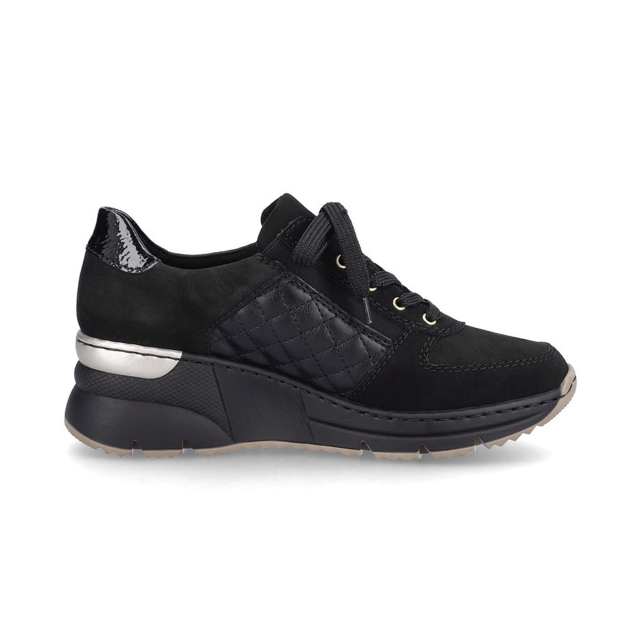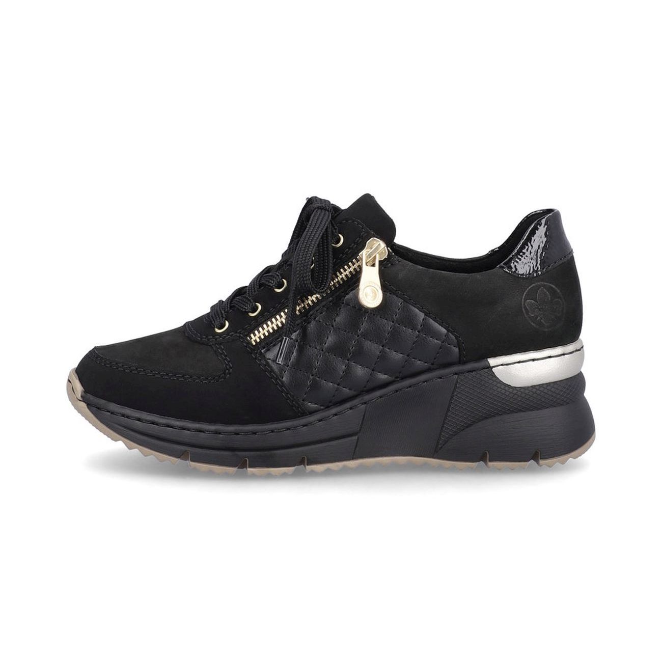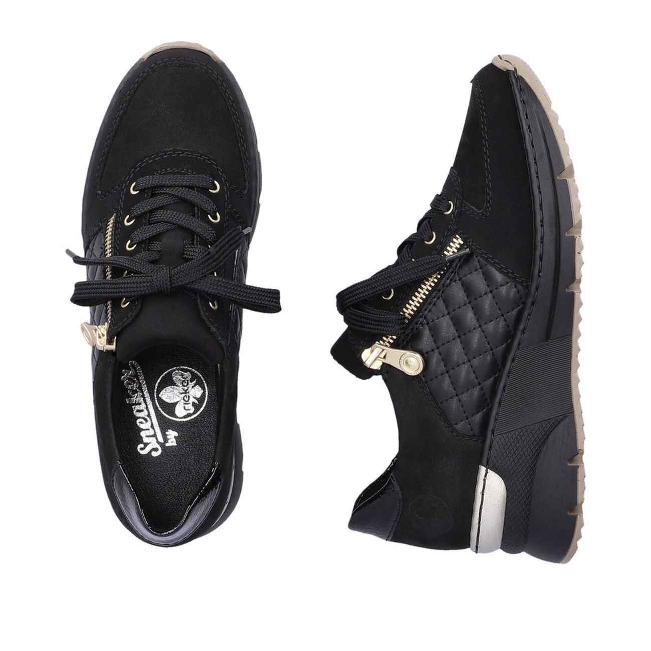 Dámské moderní tenisky Rieker jsou skvělou volbou při výberu nového kousku do Vašeho botníku. Tyto černé tenisky na klínové podešvi Vás opticky prodlouží a Vaše chůze bude neodolatelná. Kombinace materiálu a zlatý zip, lesklá aplikace na patě a stříbrná aplikace na podešvi, to vše dělá z tohoto modelu vyjímečký kousek. Díky funkčnímu zipu a tkaničkám si obuv lehce obujete a přizpůsobíte svým potřebám. Flexibilní podešev a vyjímatelná stélka jsou samozřejmostí. Vyražte s přáteli nebo na výlet a užívejte si pohodlí v těchto botách. Technologie: Antistress - podešev je díky této technologii lehká, flexibilní, absorbuje nárazy při došlapu a snadno se přizpůsobí každé noze. Vyjímatelná stélka. Výrobní způsob - šitá obuv.