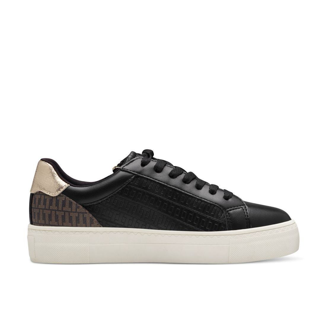 Detailní informace Moderní, dámské tenisky Tamaris v černé barvě, které Vám nesmí chybět v botníku. Tyto boty mají originální styl, který se vyznačuje vyvýšenou platformou a lesklými prvky, které jsou dokonalým kontrastem k černé barvě. Celkový design podtrhuje na boční straně potisk s písmenem "T". Díky tkaničkám si nastavíte šíři obuvi přesně tak, jak potřebujete. Uvnitř je pohodlná, měkká stélka, která je navíc vyjímatelná. Můžete jí tak kdykoliv vyndat, očistit či provětrat.