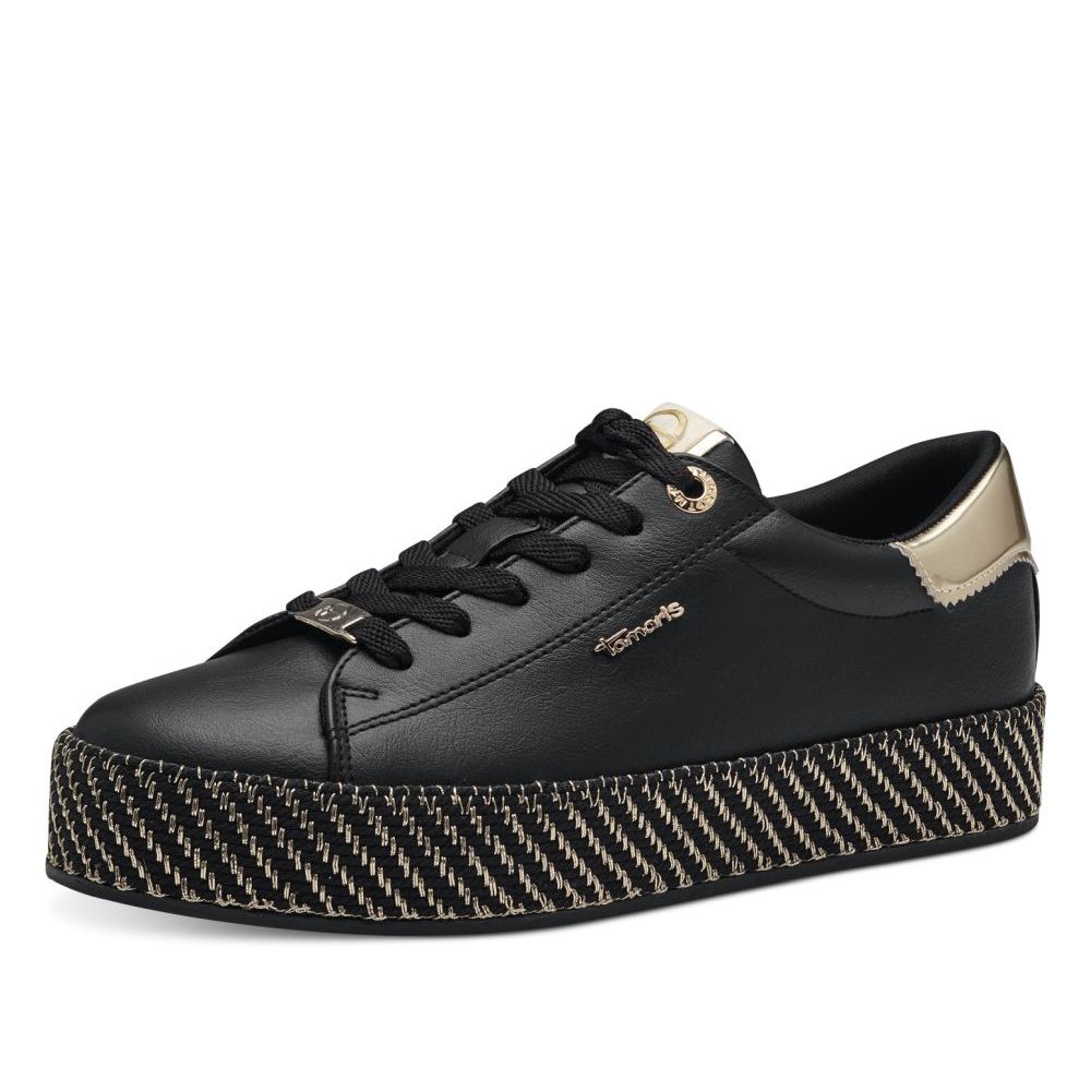 Originální dámské tenisky Tamaris v černé barvě, které budou ozdobou Vašeho outfitu. Na první pohled zaujme vyšší podešev černé barvy s lesklým prošíváním, která skvěle doplňuje černý svršek obuvi. Celkový design doplňují doplňky ve zlaté barvě. Díky tkaničkám si boty můžete utáhnout dle svých potřeb. Tyto boty se perfektně hodí k džínám či sukni.
