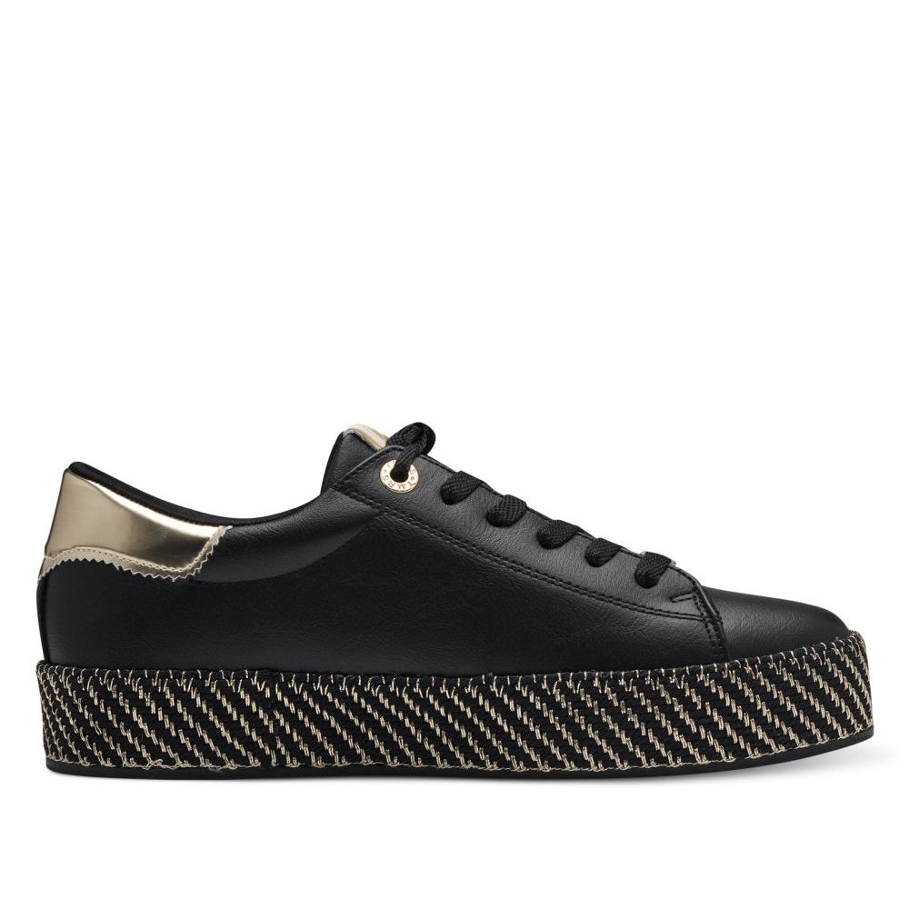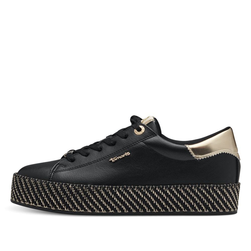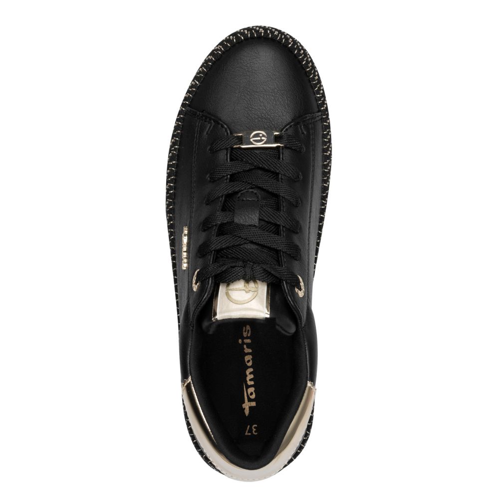 Detailní informace Originální dámské tenisky Tamaris v černé barvě, které budou ozdobou Vašeho outfitu. Na první pohled zaujme vyšší podešev černé barvy s lesklým prošíváním, která skvěle doplňuje černý svršek obuvi. Celkový design doplňují doplňky ve zlaté barvě. Díky tkaničkám si boty můžete utáhnout dle svých potřeb. Tyto boty se perfektně hodí k džínám či sukni.