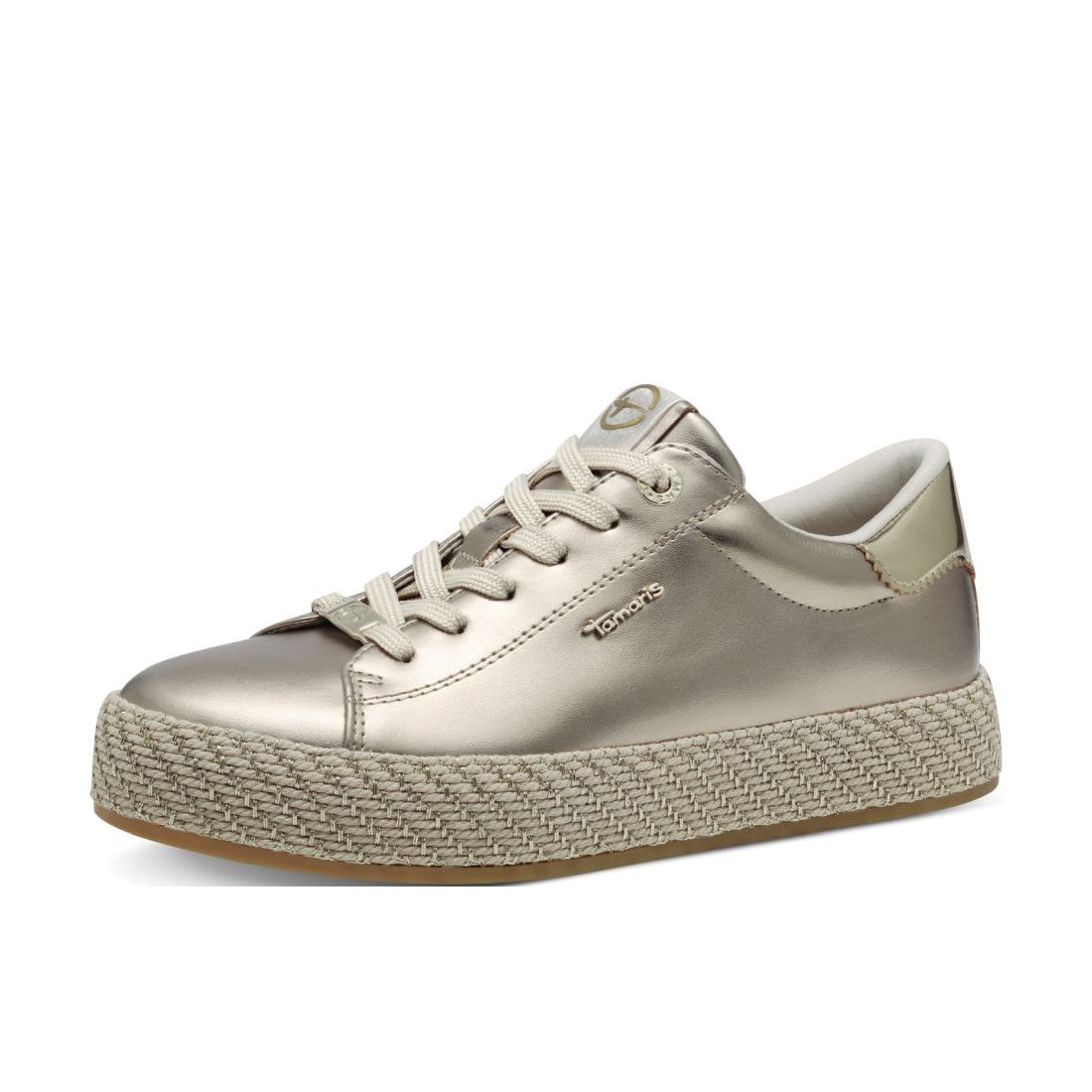 Detailní informace Originální dámské tenisky Tamaris ve zlaté barvě, které budou ozdobou Vašeho outfitu. Na první pohled zaujme vyšší podešev béžové barvy, která skvěle doplňuje lesklý svršek obuvi. Celkový design doplňují doplňky ve zlaté barvě. Díky tkaničkám si boty můžete utáhnout dle svých potřeb. Tyto boty se perfektně hodí k džínám či sukni.