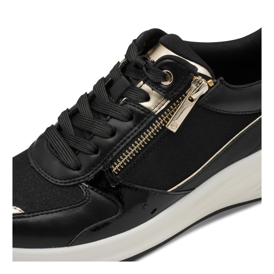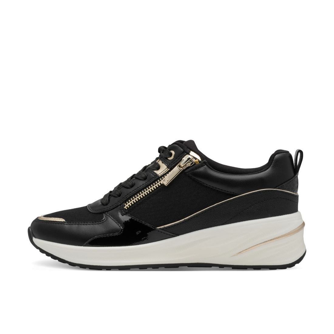 Tyto dámské tenisky na vyvýšené podešvi jsou výbornou volbou. Černý svrchový materiál je doladěn zlatými aplikacemi - na špici obuvi, proužkem na boku obuvi a na jazyku. Díky funkčnímu zipu a tkaničkám se snadno obujete. Měkká stélka se přizpůsobí tvaru chodidla a zajistí Vám pohodlí po celou dobu nošení. Díky vyvýšené podešvi budete mít stabilní chůzi a prodlouží Vám to postavu. Tento model nabízíme i v další barevné variantě (platí do vyprodání zásob). Technologie: Touch-it - měkká stélka, která se dokonale přizpůsobí tvaru nohy, a díky tomu při nošení zajišťuje optimální pohodlí. Tato obuv má vyjímatelnou stélku. Vegan - obuv vyrobena bez použití živočišných materiálů.