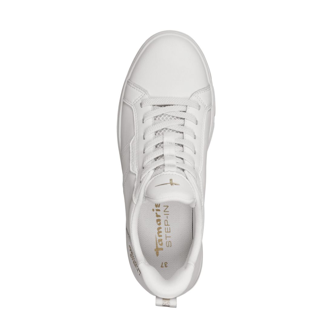 Moderní dámské tenisky od značky Tamaris v bílé barvě, co kombinují městský styl a maximální pohodlí. Lehce je sladíte s jakýmkoliv outfitem. Obouvání Vám usnadní inovativní technologie Step-in (flexibilní patní část v kombinaci s pružnými tkaničkami), díky které stačí vklouznout do obuvi a můžete jít. Technologie: Step-in - díky této technologie bude obouvání jedna radost. Inovativní patní část v kombinaci s elastickými tkaničkami umožňuje snadné a rychlé obutí bez námahy. Stačí vklouznout a můžete jít. Vyjímatelná stélka - stélku můžete kdykoliv vyndat, očistit, vyvětrat, případně vyměnit za ortopedickou.