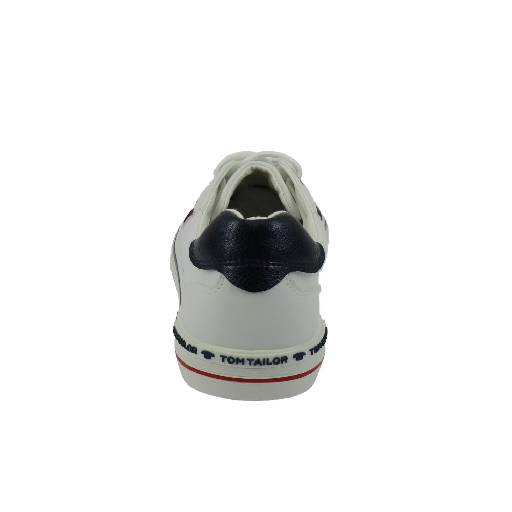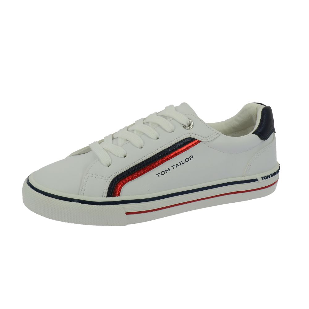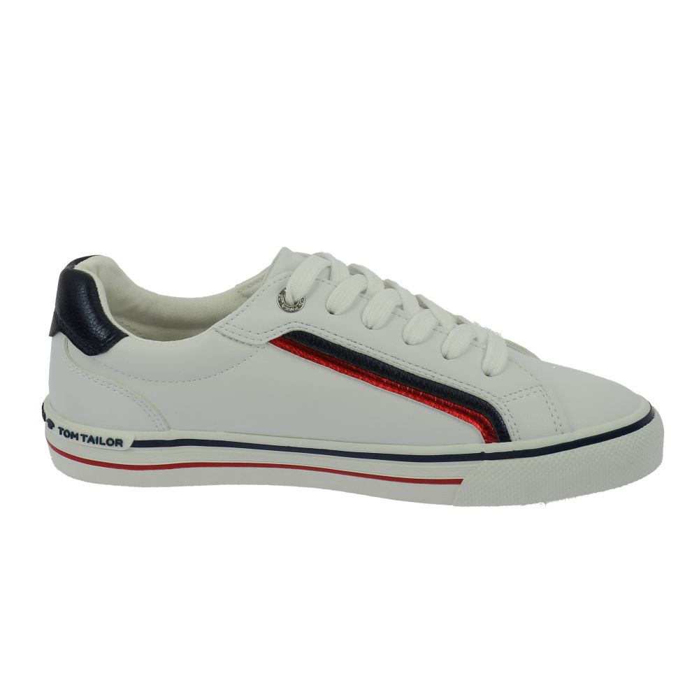 Dámské tenisky Tom Tailor v bílé barvě doplněné červenými a tmavě-modrými prvky. Svršek je z kvalitní syntetiky. Z vnější strany na boku a v patní části je ozdobný nápis Tom Tailor. Zesílený materiál na špici zajistí maximální ochranu prstů. Díky šněrování si boty můžete přizpůsobit přesně podle svých představ. Uvnitř najdete pohodlnou stélku. Tento styl obuvi je vhodný jak na běžné procházky, tak do práce či na nákupy.