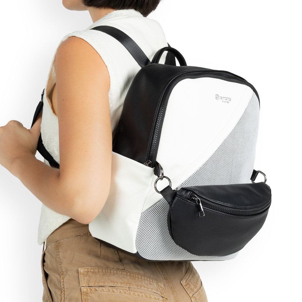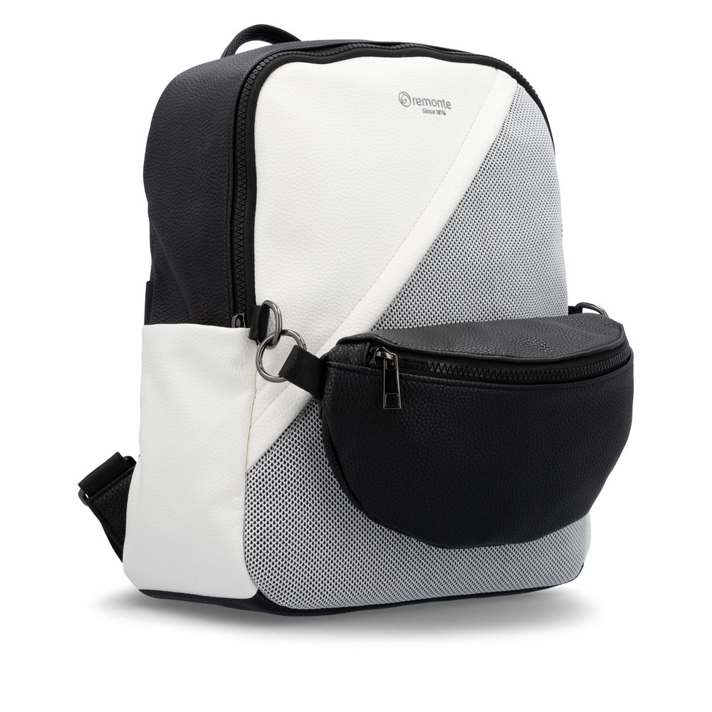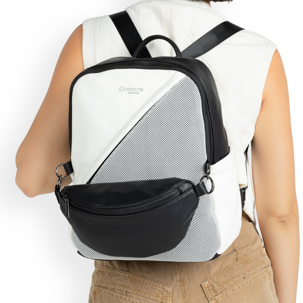 Moderní dámský batoh od značky Remonte zaujme na první pohled svým originálním designem a promyšleným uspořádáním úložného prostoru. Přední kapsička je odepínatelná a tak ji lze použít i samostatně jako ledvinku. Z přední i zadní strany je kapsička na zip. Uvnitř najdete menší přihrádky na drobnosti. Z horní strany je zip, který uzavírá vnitřní prostor. Popruhy jsou délkově nastivetelné pro pohodlné nošení. Tento stylový batoh si rychle zamilujete.