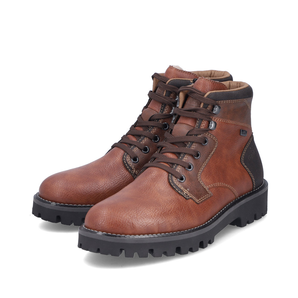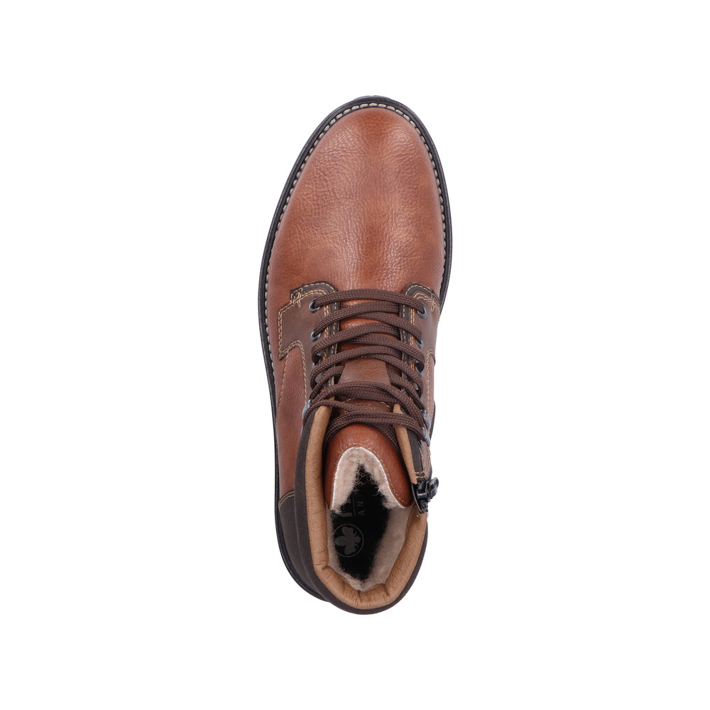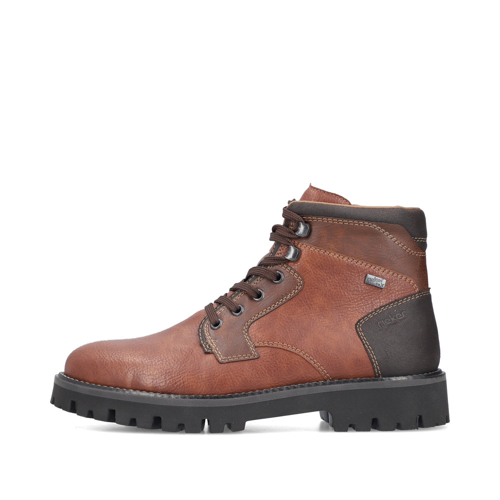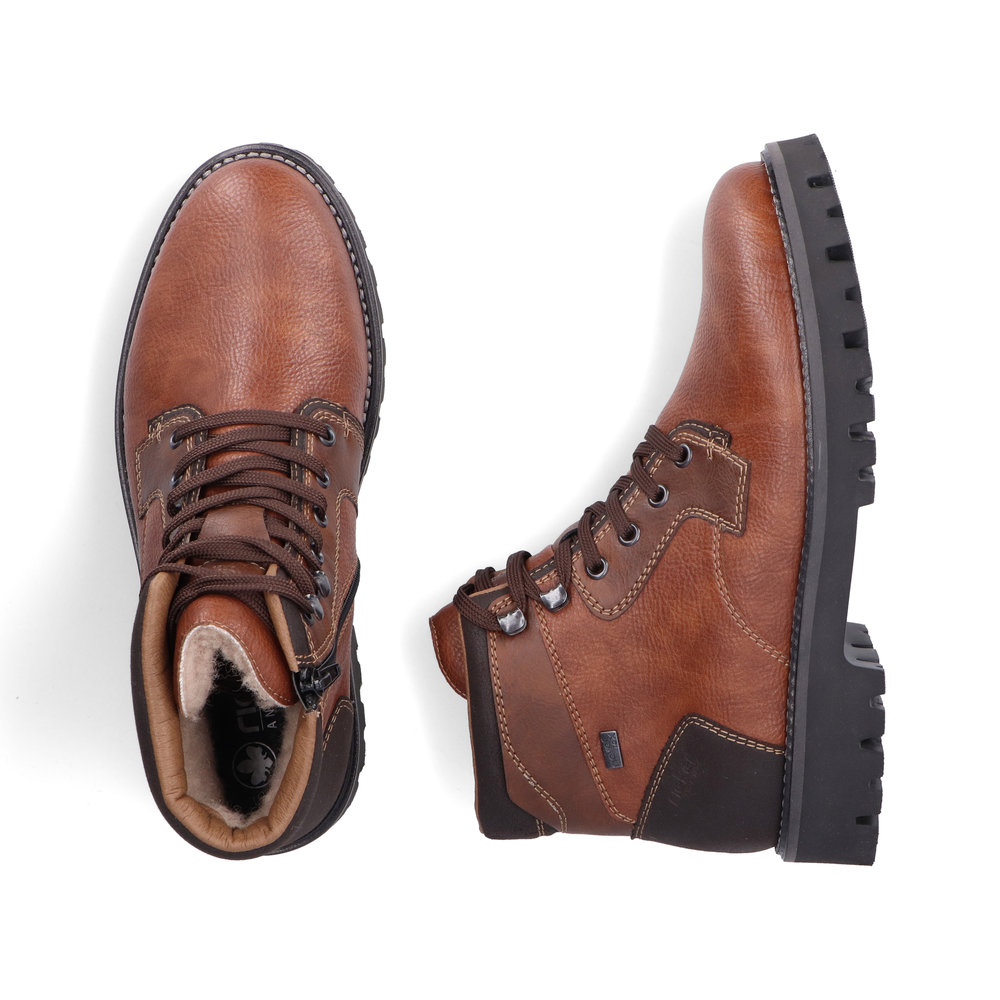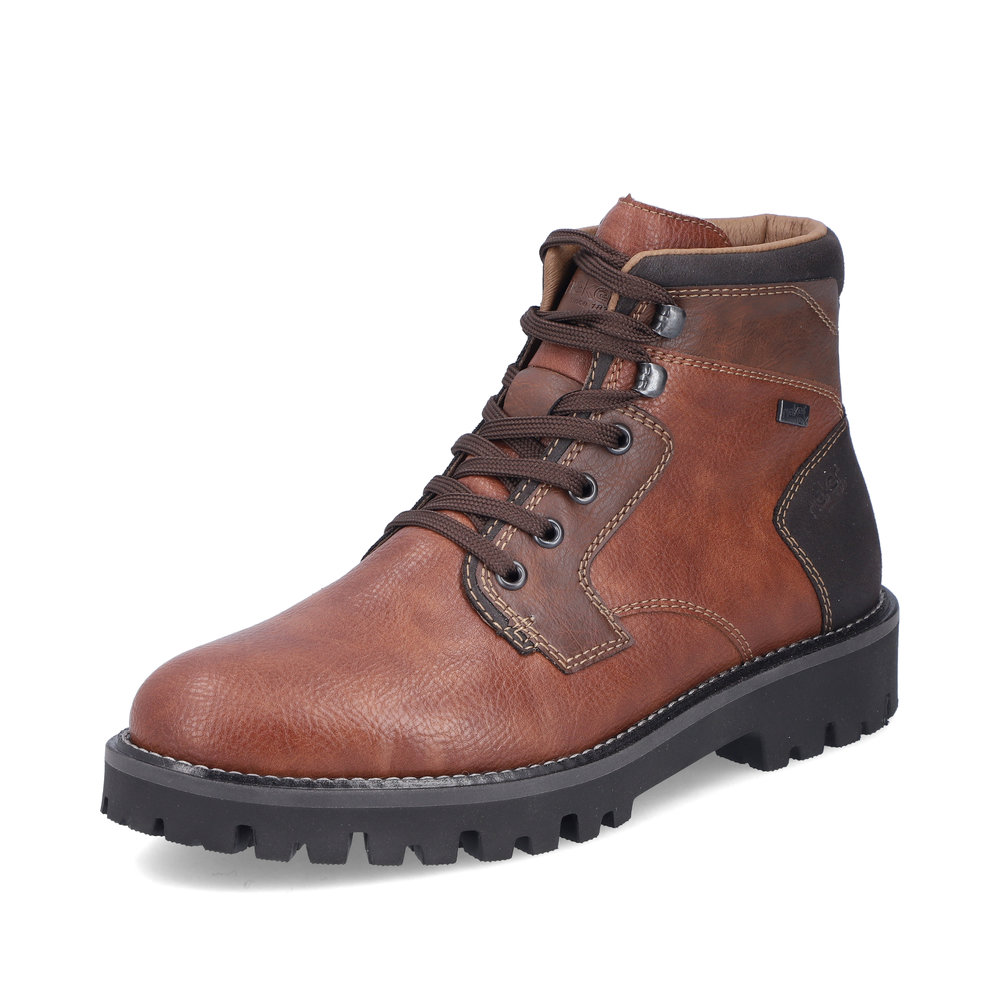 Pohodlné pánské boty od značky Rieker, co mají styl. Kombinace hnědých odstínu svršku dodává obuvi originální vzhled. Díky nepromokavé membráně s technologií RiekerTex Vám do obuvi nezateče. Rychlé obouvání Vám zajistí zip z vnitřní strany a díky tkaničkám si upravíte šíři obuvi dle svých potřeb. Technologie: RiekerTEX - obuv s tímto označením je prodyšná, ale zároveň odolná vůči vodě. Je to díky zvolenému výrobnímu procesu, kdy mezi svrchní díl a podšívku je vložena goretexová membrána. Díky tomu má obuv optimální ochranu proti vlhkosti a výbornou ochranu proti chladu. Antistress - podešev je díky této technologii lehká, flexibilní, absorbuje nárazy při došlapu a snadno se přizpůsobí každé noze. Podšívka je z pravé ovčí vlny. Výrobní způsob obuvi - lepená obuv.