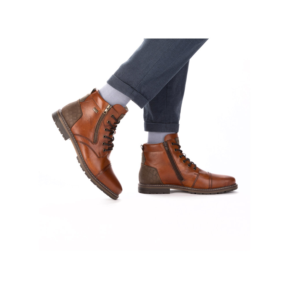 Elegantní pánské kotníkové boty od značky Rieker, které si zamilujete po prvním obutí. Obuv je velmi pohodlná. V chladných zimních dnech Vás zahřeje zateplená podšívka. Svrchní kožený materiál hnědé barvy je moderně doladěn detaily v patní části. Díky nepromokavé membráně s technologií RiekerTex se nestane, že by Vám do obuvi zateklo. Obouvání Vám usnadní zipy po stranách a díky tkaničkám si obuv utáhnete podle svých potřeb. Jsou vhodné jak na vycházky s přáteli, tak na cestu do práce. Technologie: RiekerTEX - obuv s tímto označením je prodyšná, ale zároveň odolná vůči vodě. Je to díky zvolenému výrobnímu procesu, kdy mezi svrchní díl a podšívku je vložena goretexová membrána. Díky tomu má obuv optimální ochranu proti vlhkosti a výbornou ochranu proti chladu. Antistress - podešev je díky této technologii lehká, flexibilní, absorbuje nárazy při došlapu a snadno se přizpůsobí každé noze. Výrobní způsob obuvi - lepená obuv.