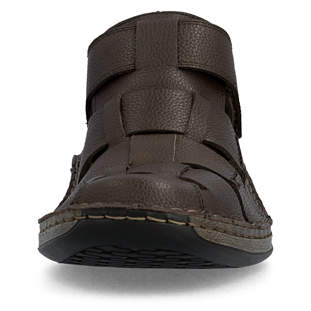 Detailní informace Kožené pánské sandály Rieker ve hnědé barvě s jemným prošíváním kolem podešve. Snadné obouvání díky zapínání na suchý zip. Tento model je širšího střihu. Lehká, flexibilní podešev tlumí nárazy a přizpůsobí se každému kroku.