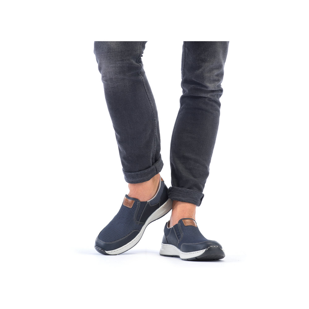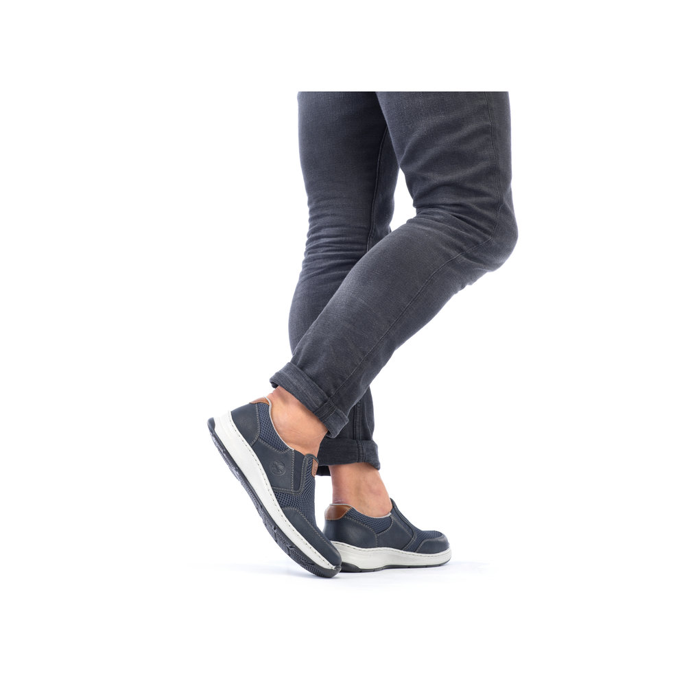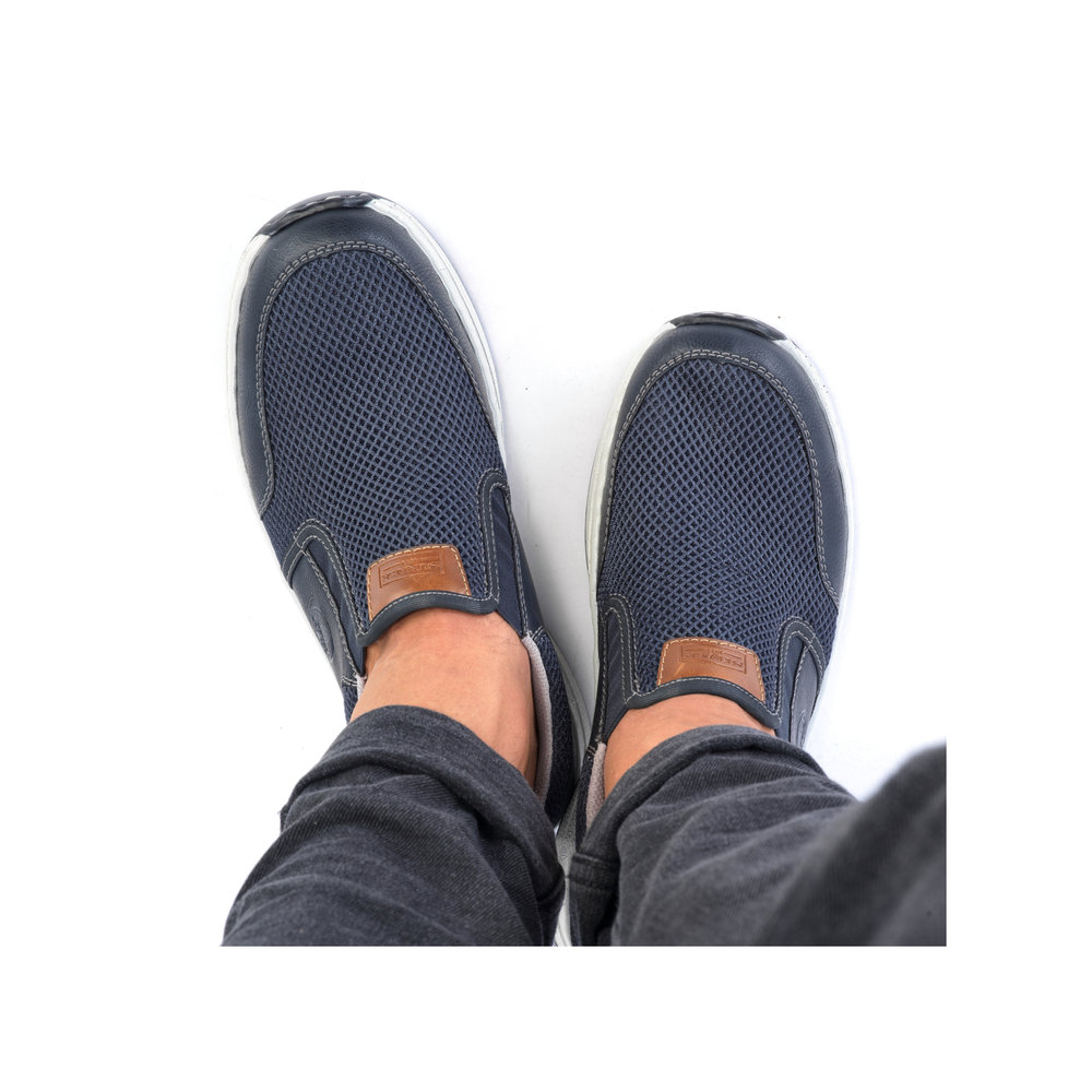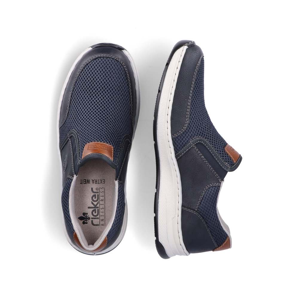 Tyto moderní pánské mokasíny Rieker jsou vhodné pro širší chodidlo. Kombinace svrchních materiálů v modré barvě a hnědé aplicace na patě a nártu spolu s bílou podešví tvoří tento svěží model pro moderní muže. Svrchní materiál ze syntetického materiálu je kombinovaný s textilním materiálem, díky němuž je obuv vzdušná. Snadné obouvání díky dvěma všitým gumičkám. Pohodlná vyjímatelná stélka a flexibilní podešev, která se přizpůsobí každému Vašemu kroku, Vám zajistí pohodlí, ať už jdete kamkoliv. Tento model se skvěle hodí například k riflím a sportovní bundě. Technologie: Antistress - podešev je díky této technologii lehká, flexibilní, absorbuje nárazy při došlapu a snadno se přizpůsobí každé noze. Extraweit – obuv s tímto označením je určena pro široké chodidlo. Vyjímatelná stélka