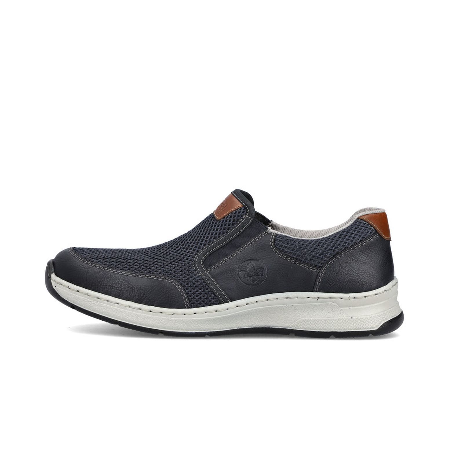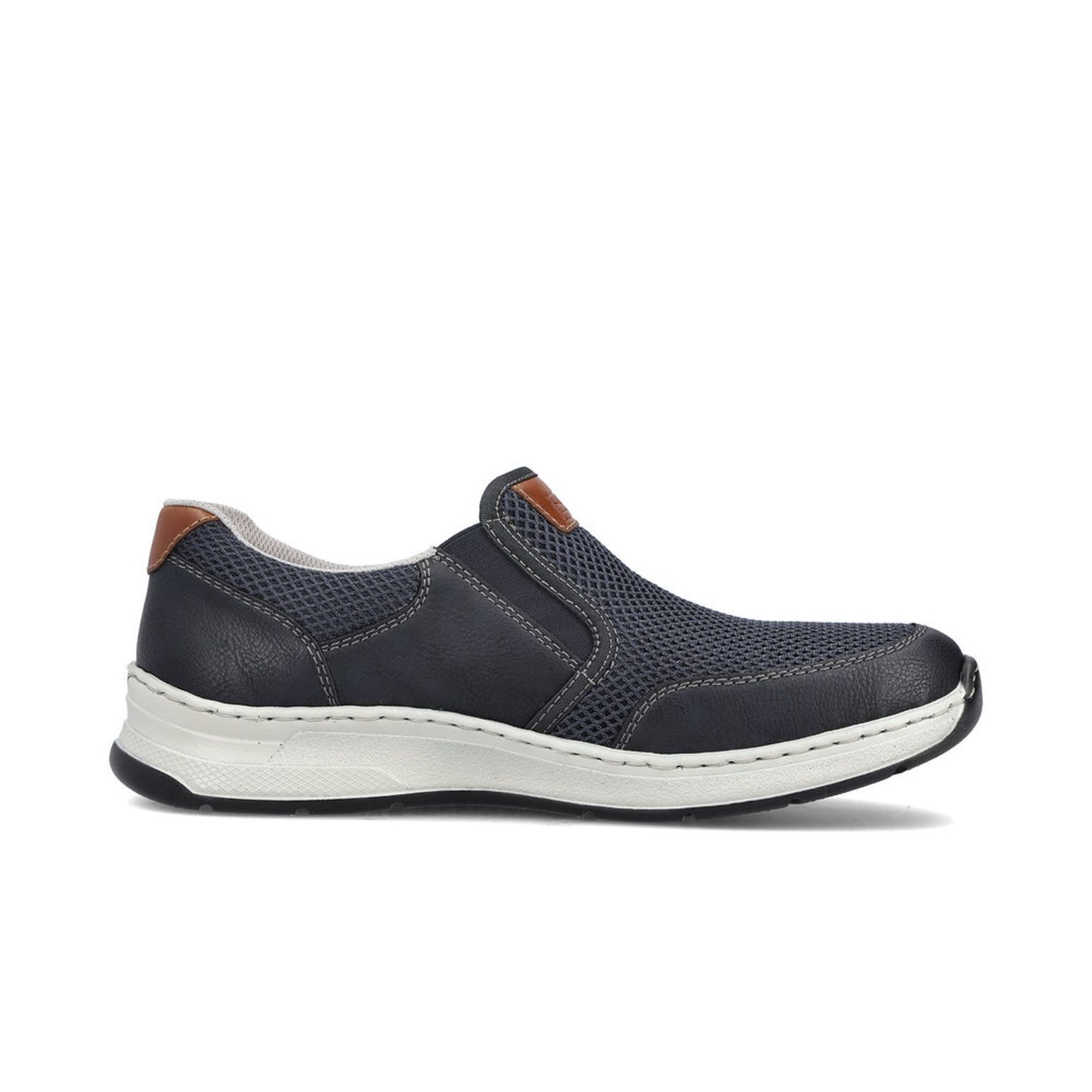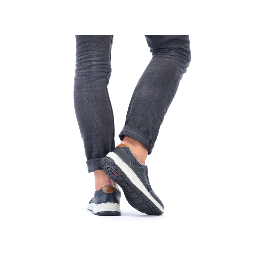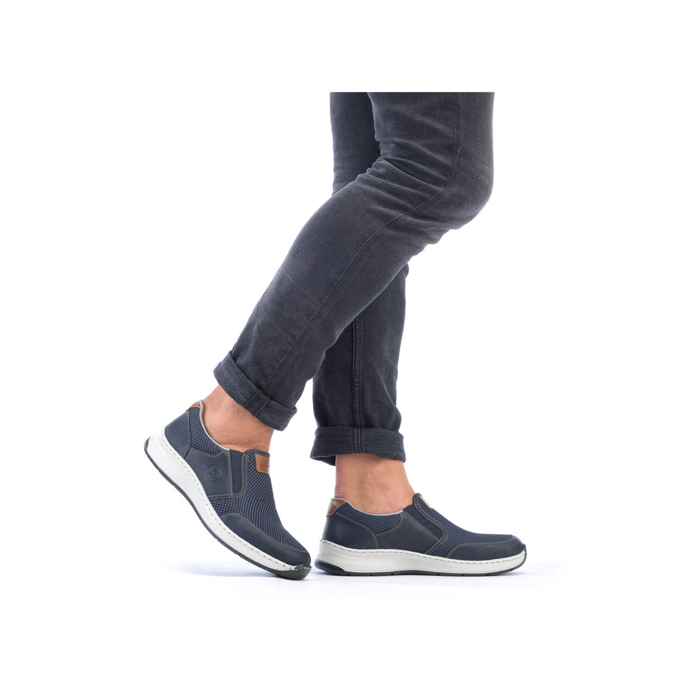 Tyto moderní pánské mokasíny Rieker jsou vhodné pro širší chodidlo. Kombinace svrchních materiálů v modré barvě a hnědé aplicace na patě a nártu spolu s bílou podešví tvoří tento svěží model pro moderní muže. Svrchní materiál ze syntetického materiálu je kombinovaný s textilním materiálem, díky němuž je obuv vzdušná. Snadné obouvání díky dvěma všitým gumičkám. Pohodlná vyjímatelná stélka a flexibilní podešev, která se přizpůsobí každému Vašemu kroku, Vám zajistí pohodlí, ať už jdete kamkoliv. Tento model se skvěle hodí například k riflím a sportovní bundě. Technologie: Antistress - podešev je díky této technologii lehká, flexibilní, absorbuje nárazy při došlapu a snadno se přizpůsobí každé noze. Extraweit – obuv s tímto označením je určena pro široké chodidlo. Vyjímatelná stélka