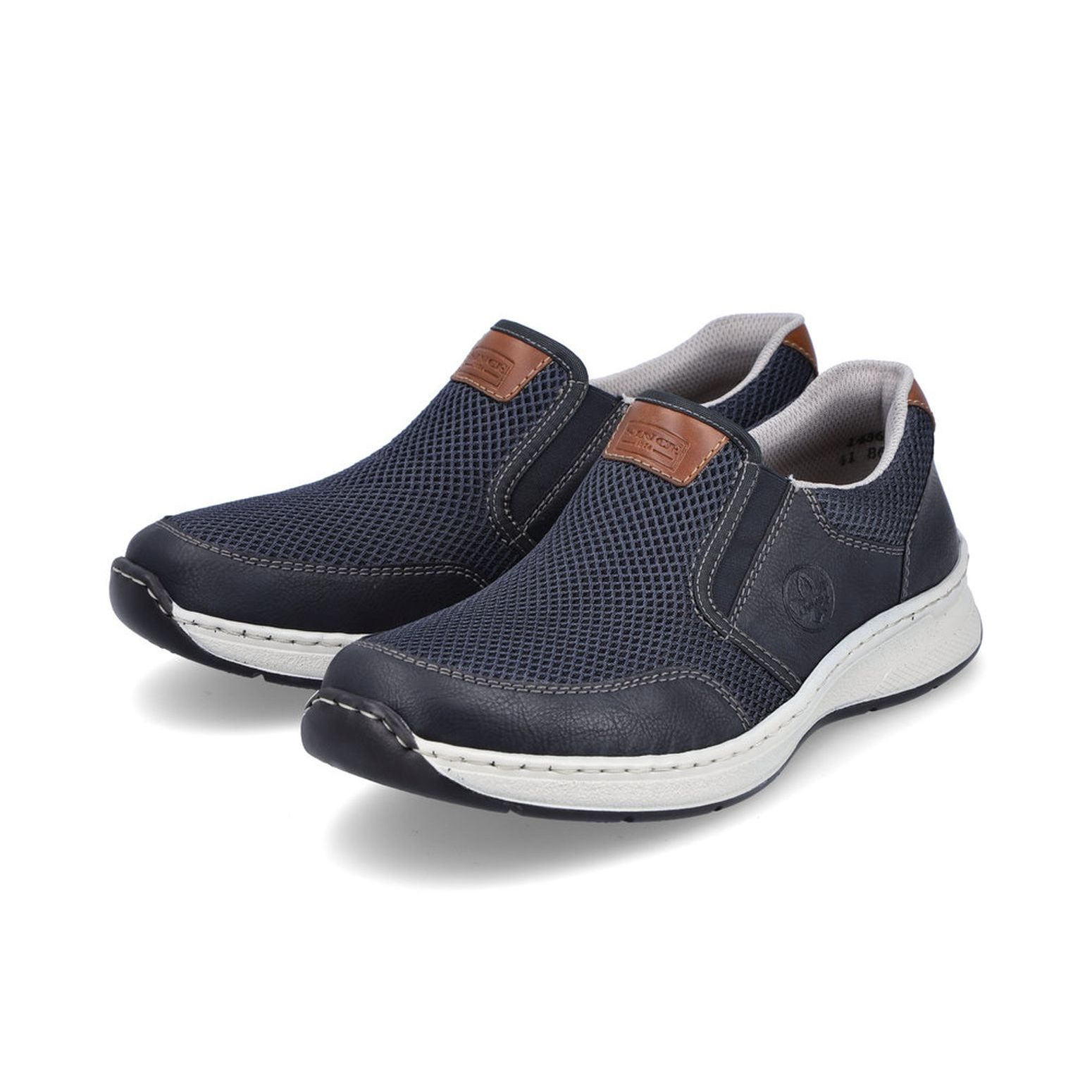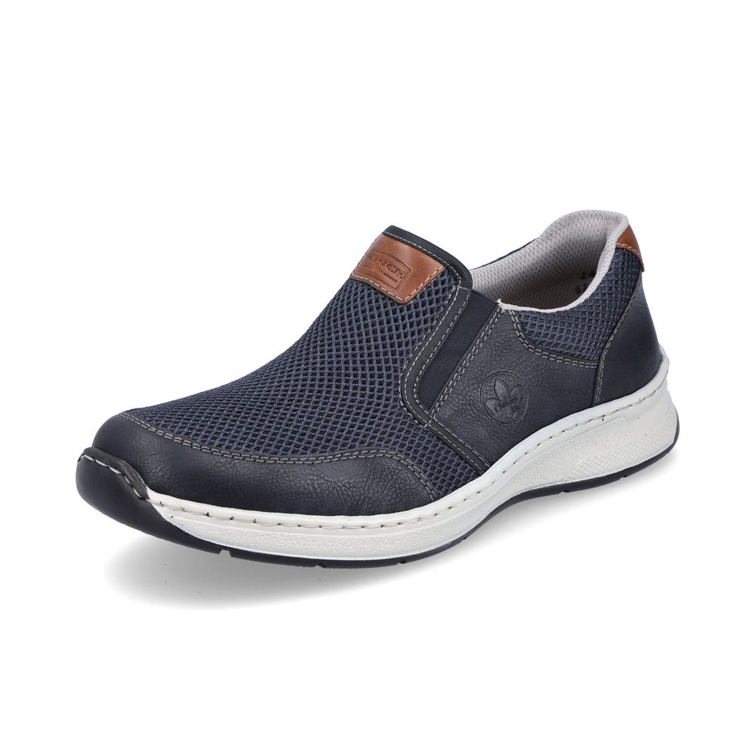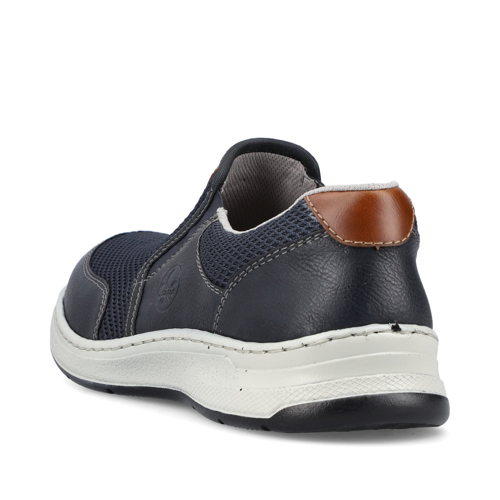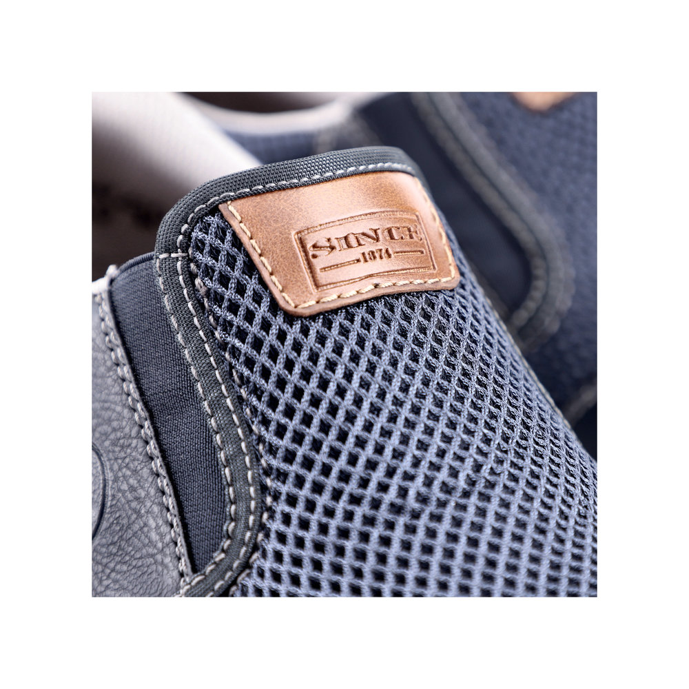 Tyto moderní pánské mokasíny Rieker jsou vhodné pro širší chodidlo. Kombinace svrchních materiálů v modré barvě a hnědé aplicace na patě a nártu spolu s bílou podešví tvoří tento svěží model pro moderní muže. Svrchní materiál ze syntetického materiálu je kombinovaný s textilním materiálem, díky němuž je obuv vzdušná. Snadné obouvání díky dvěma všitým gumičkám. Pohodlná vyjímatelná stélka a flexibilní podešev, která se přizpůsobí každému Vašemu kroku, Vám zajistí pohodlí, ať už jdete kamkoliv. Tento model se skvěle hodí například k riflím a sportovní bundě. Technologie: Antistress - podešev je díky této technologii lehká, flexibilní, absorbuje nárazy při došlapu a snadno se přizpůsobí každé noze. Extraweit – obuv s tímto označením je určena pro široké chodidlo. Vyjímatelná stélka