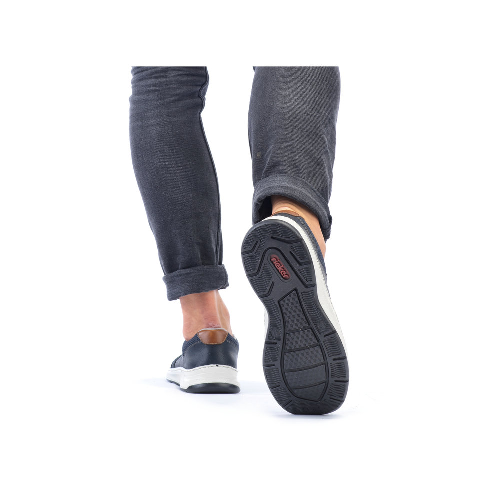 Detailní informace Tyto moderní pánské mokasíny Rieker jsou vhodné pro širší chodidlo. Kombinace svrchních materiálů v modré barvě a hnědé aplicace na patě a nártu spolu s bílou podešví tvoří tento svěží model pro moderní muže. Svrchní materiál ze syntetického materiálu je kombinovaný s textilním materiálem, díky němuž je obuv vzdušná. Snadné obouvání díky dvěma všitým gumičkám. Pohodlná vyjímatelná stélka a flexibilní podešev, která se přizpůsobí každému Vašemu kroku, Vám zajistí pohodlí, ať už jdete kamkoliv. Tento model se skvěle hodí například k riflím a sportovní bundě.