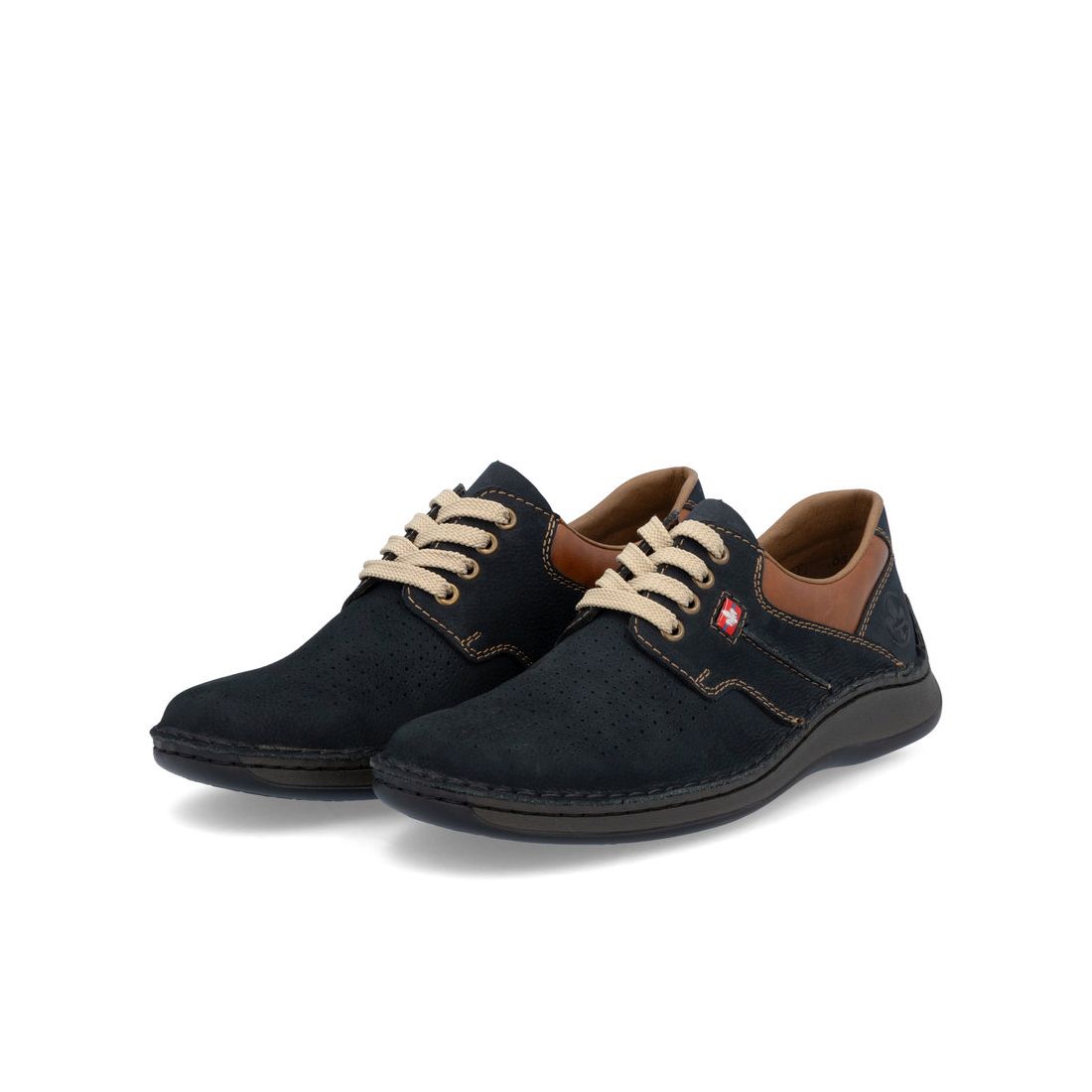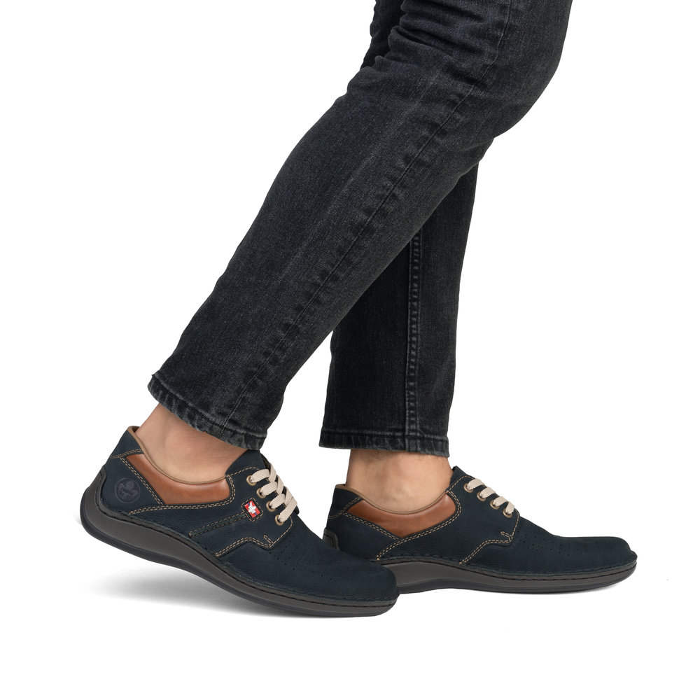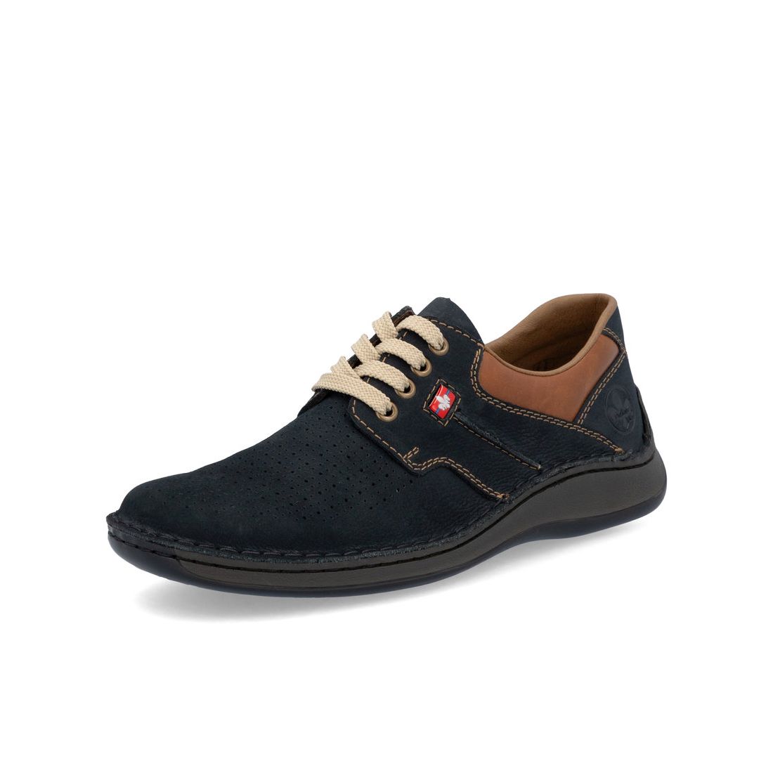 Detailní informace Pánské polobotky Rieker modré barvy, s perforovaným svrškem, si rychle oblíbíte. Jejich sportovně elegantní design podtrhuje lem hnědé barvy kolem kotníku, světlé prošívání a šněrování, díky kterému si usnadníte nazouvání a zároveň přizpůsobíte šíři obuvi podle svých potřeb. Uvnitř najdete pohodlnou koženou stélku. Díky podešvi s technologií Antistress budete mít maximální komfort při chůzi.
