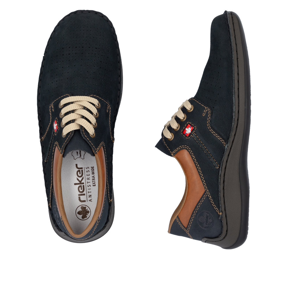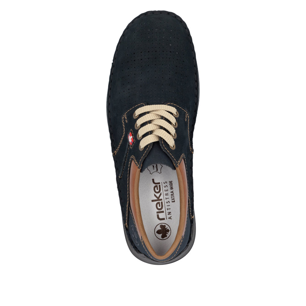 Pánské polobotky Rieker modré barvy, s perforovaným svrškem, si rychle oblíbíte. Jejich sportovně elegantní design podtrhuje lem hnědé barvy kolem kotníku, světlé prošívání a šněrování, díky kterému si usnadníte nazouvání a zároveň přizpůsobíte šíři obuvi podle svých potřeb. Uvnitř najdete pohodlnou koženou stélku. Díky podešvi s technologií Antistress budete mít maximální komfort při chůzi. Technologie: Antistress - podešev je díky této technologii lehká, flexibilní, absorbuje nárazy při došlapu a snadno se přizpůsobí každé noze. Extraweit - obuv s tímto označením je určena pro široké chodidlo.