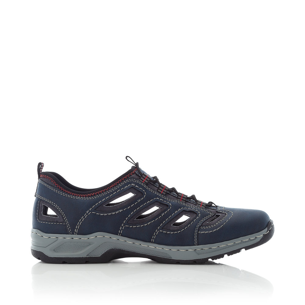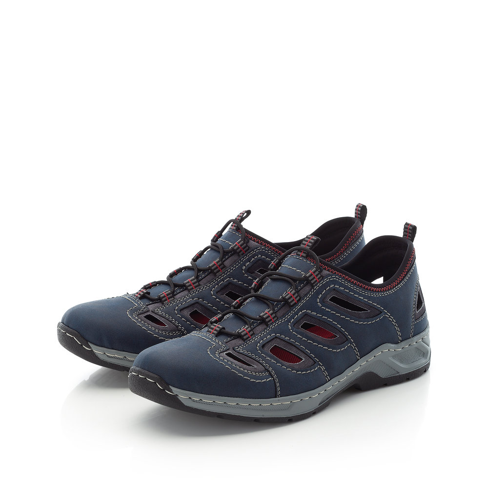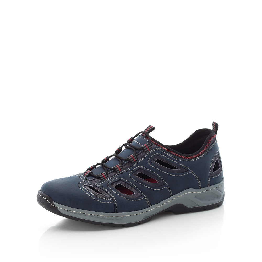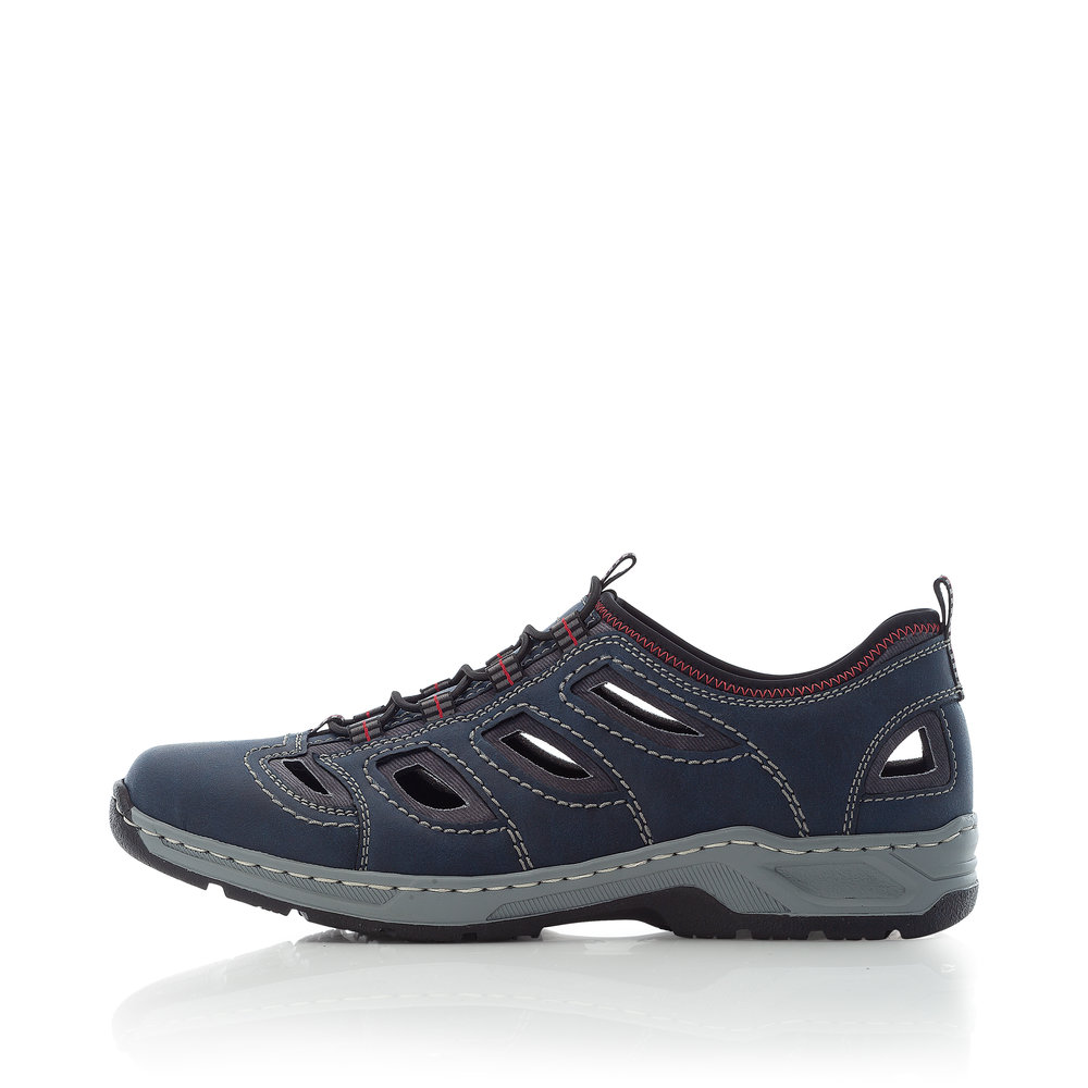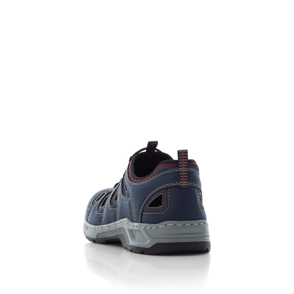 Pohodlné pánské uzavřené sandály sportovního stylu, v modré barvě. Svršek obuvi je z kvalitní syntetiky a je perforovaný, což zajišťuje příjemné odvětrávání. Pohodlí při každém kroku budete mít díky měkkým vyjímatelným stélkám a kvalitní podešvi s technologií Antistress, která perfektně tlumí nárazy a otřesy. Podešev je se svrškem spojena šitým způsobem, což je pro značku Rieker typické. Šitý způsob napomáhá k tomu, aby byla obuv maximálně pohodlná, více se přizpůsobovala tvaru chodidla. Technologie: Antistress - podešev je díky této technologii lehká, flexibilní, absorbuje nárazy při došlapu a snadno se přizpůsobí každé noze. Vyjímatelné stélky